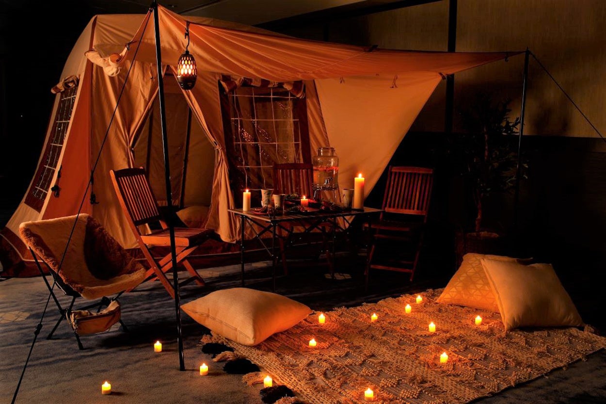 グランピング会場となるのは、ホテルのメインバンケット「舞扇(まいおうぎ)」。天井高が7.8mもある開放的な空間に、実際にアウトドアで使用する本格的なテントを張り、テーブルやチェア、ランタンなどを配します。テント1張の区画を貸し切りでご用意し、お食事は、ブッフェスタイルでお愉しみいただきます。プロジェクションマッピングによる星空の演出や、森の中にいるかのようなヒーリング音楽など、都心にいることを忘れさせてくれるようなムードたっぷりの会場の中で、ホテルシェフが作る贅沢なメニューを存分に味わえるのは、新感覚の体験です。