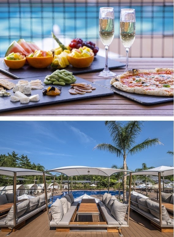 THE LIVING GARDENを一望する「パインテラス」のテラスデッキ席を貸出いたします。プール遊泳の合間の休憩場所として是非ご利用ください。生ビールやワインなどのドリンク、フルーツ盛り合わせやピッツァなどのオプションメニューもご用意しております。