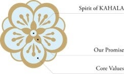 中央の円は根底思想であるSpirit of KAHALAを、これを囲む5枚の花びらはザ・カハラの基本姿勢であるOur Promise を象徴しています。