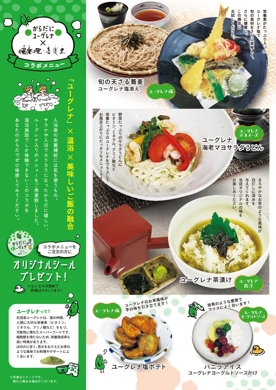 「ユーグレナ」×「温浴」×おいしいご飯の融合 をお楽しみいただけます。