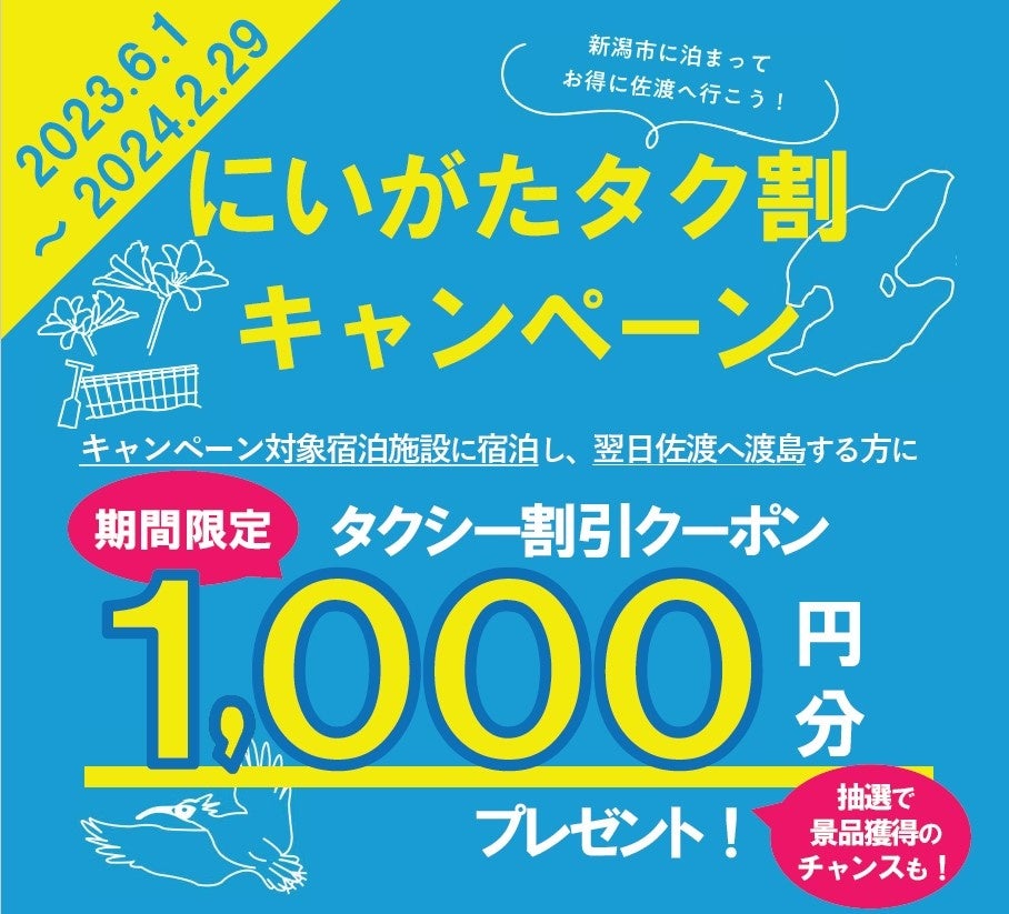 新潟市内キャンペーン対象施設に宿泊し翌日佐渡へ旅行する方に、新潟市内タクシーで使える割引クーポン1,000円分を差し上げます。