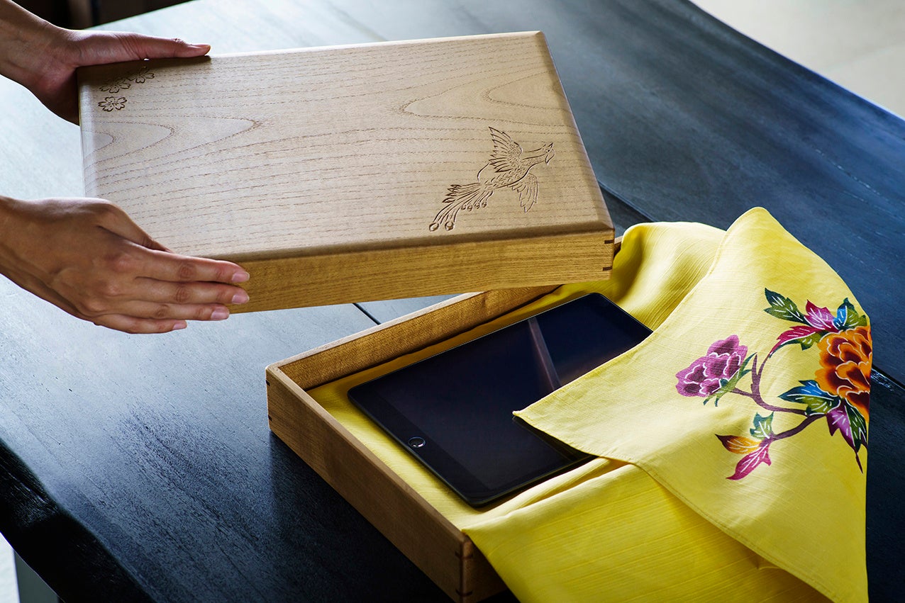本プログラムでは、デジタルから離れた環境をつくるため、チェックインの際にスマートフォンやタブレット端末などのデジタル機器を預けます。デジタル機器は、高貴な黄色地に、大きな牡丹を描いた色鮮やかな琉球紅型の風呂敷で丁寧に包み、牡丹と同じく王族の模様である尾長鳥を施した木箱に入れ、チェックアウトまでフロントで保管します。