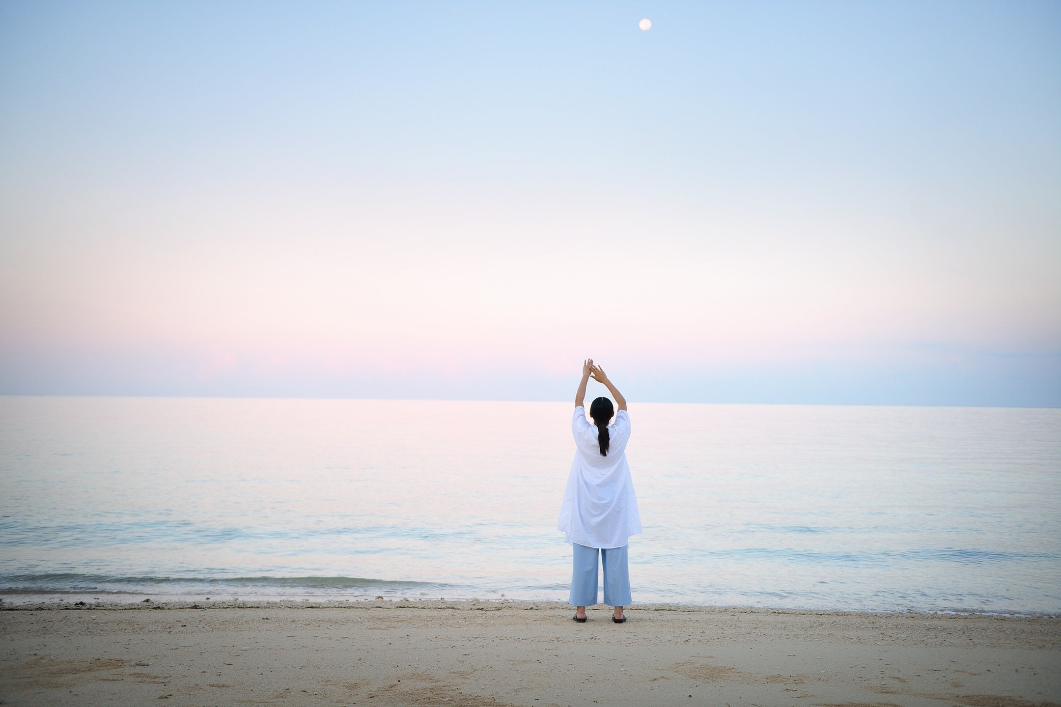 琉球紅型に没頭した翌朝は、星のや沖縄の目の前の浜辺で「波音深呼吸」を行います。夜明け前の静かな波音と海風に包まれて、波の音を聞きながらのストレッチで、身体をゆっくりと目覚めさせます。そして、日の出と共にあざやかになってゆく海を眺めながら、心穏やかに自分と向き合うことで、日常生活への活力を取り戻します。