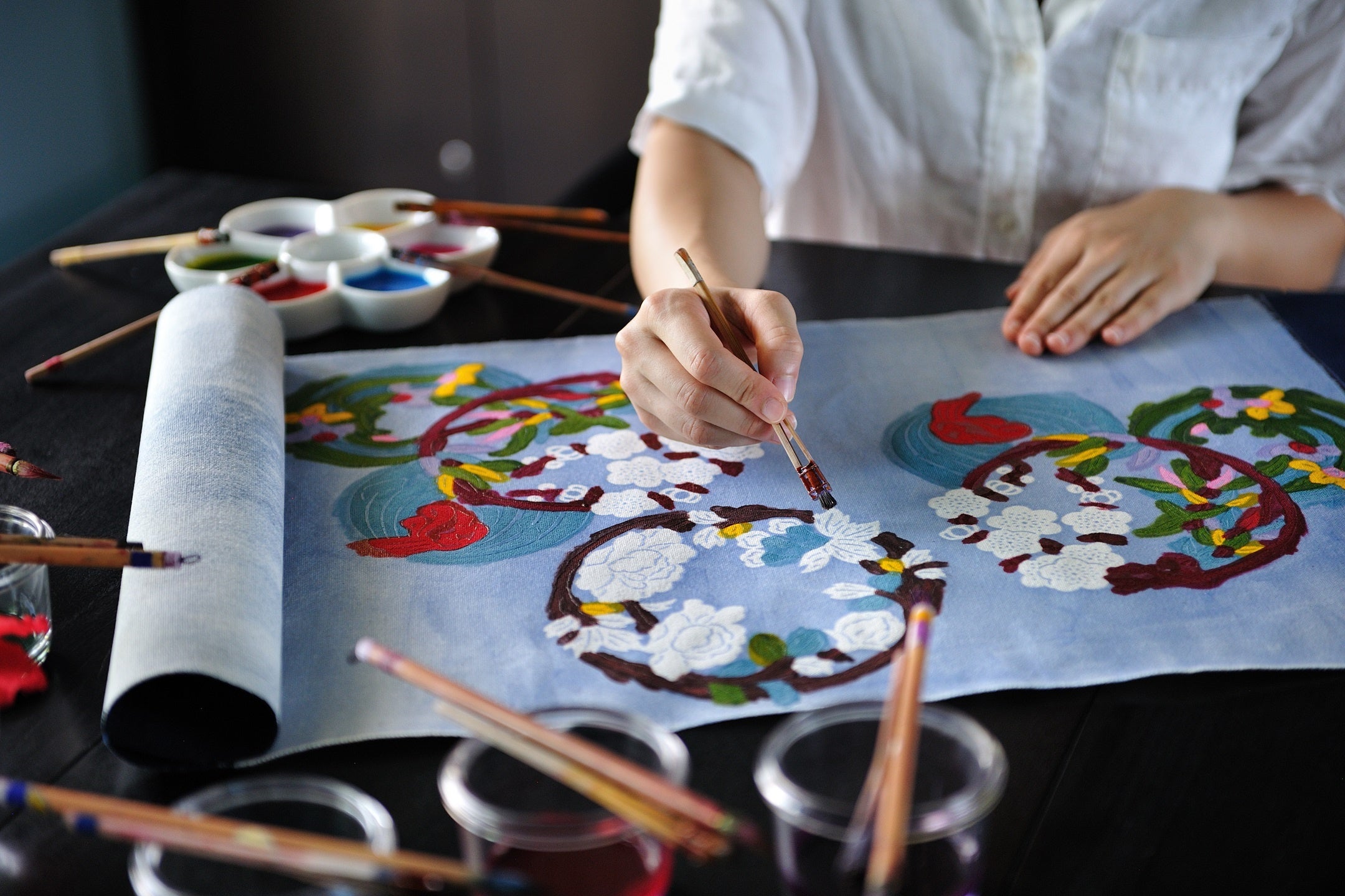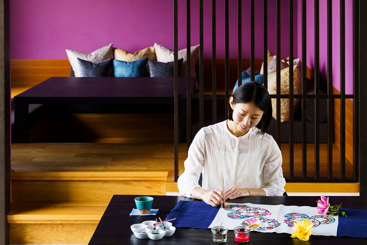 星のや沖縄では、デジタル機器から膨大な情報が飛び交う現代にデジタルから離れ、リフレッシュして欲しいと本プログラムを開発しました。沖縄独特の気候風土のなかで育まれてきた「琉球紅型」に着目し、紅型の制作に没頭することで自分自身と向き合います。琉球王朝の交易文化と共に繁栄した紅型には、交流のあった国内外の文化や自然を採り入れ、南国ならではの強い日差しに映える大胆な配色は、青い空や海、豊かな緑を持つ沖縄の自然を映し出しています。紅型制作を通して沖縄の美しい自然と伝統の文化に浸ります。