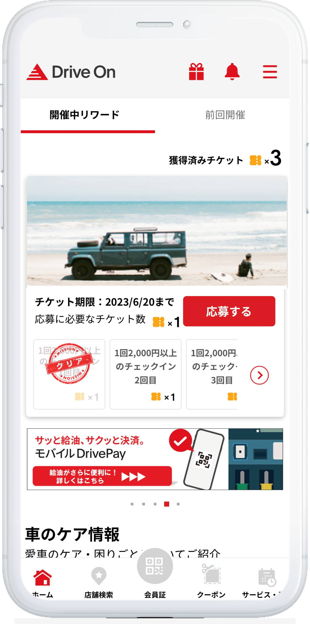 以下のミッションを達成したお客様にDrive Onリワードドチケットを付与し、チケット1枚につき1回抽選にご参加いただけます。 ・Drive Onでのサービスご利用(1回あたり15L以上の給油または、カーケア商品のご購入・洗車等のサービス利用等):1枚 ・モバイルDrivePayのご利用:5枚 ・Drive OnからのPIT in plusご予約・作業完了:10枚 |