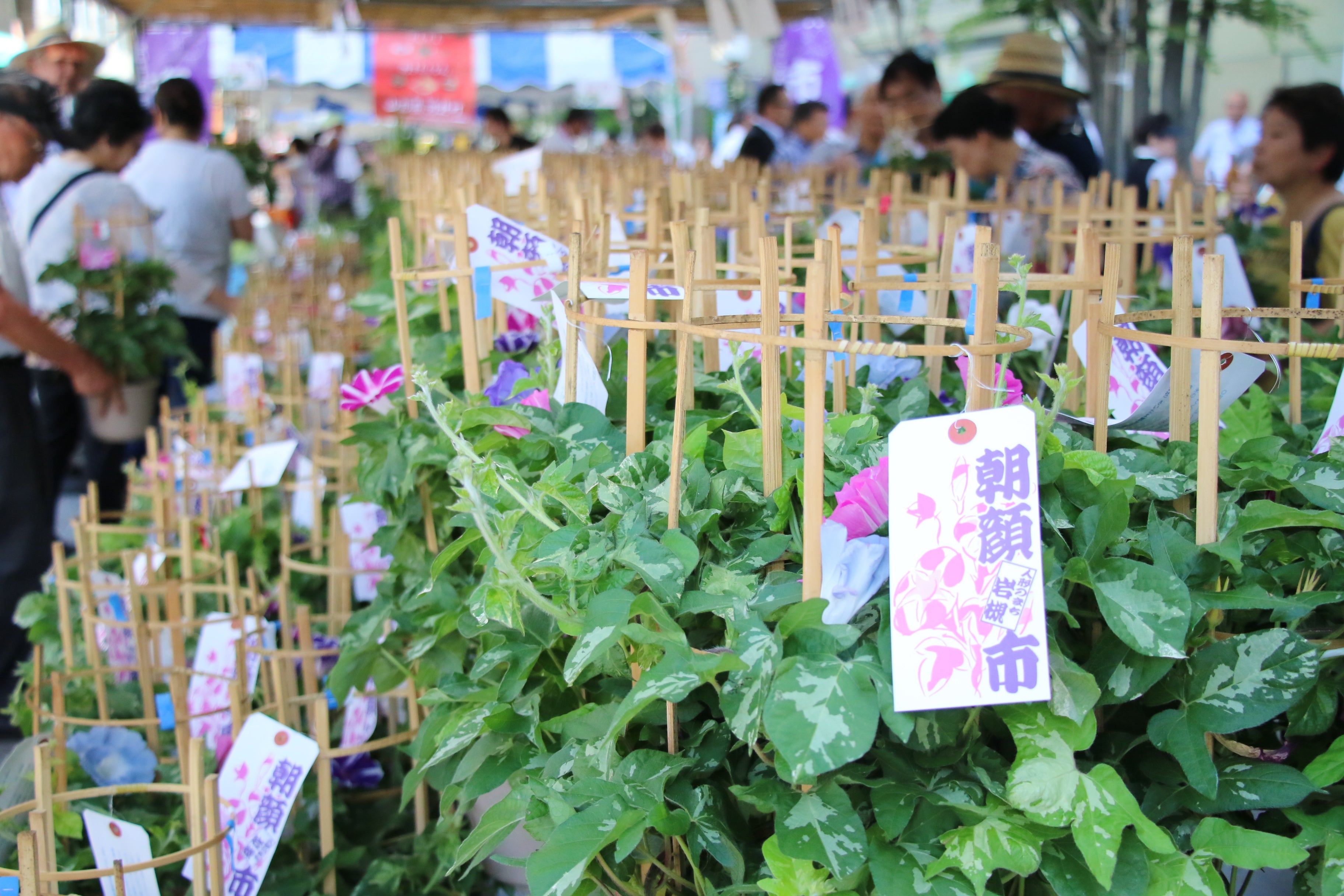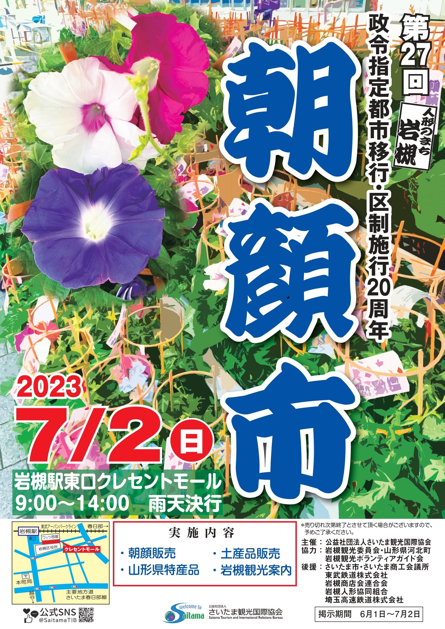 7月2日(日)9:00〜14:00、岩槻駅東口クレセントモールにて開催します。この朝顔市は、全国的に有名な「入谷の朝顔市」に岩槻産の朝顔が出荷されていることを市内外に広く紹介することを目的に開催しているもので、27回目を迎えます。今年は、さいたま観光大使「第15代さいたま小町」による朝顔販売のお手伝いや、山形県河北町の特産品の販売、岩槻の名所をめぐる岩槻観光ツアーなど、4年ぶりに賑やかな朝顔市が戻ってきます!なお、ステージイベントは実施しません。