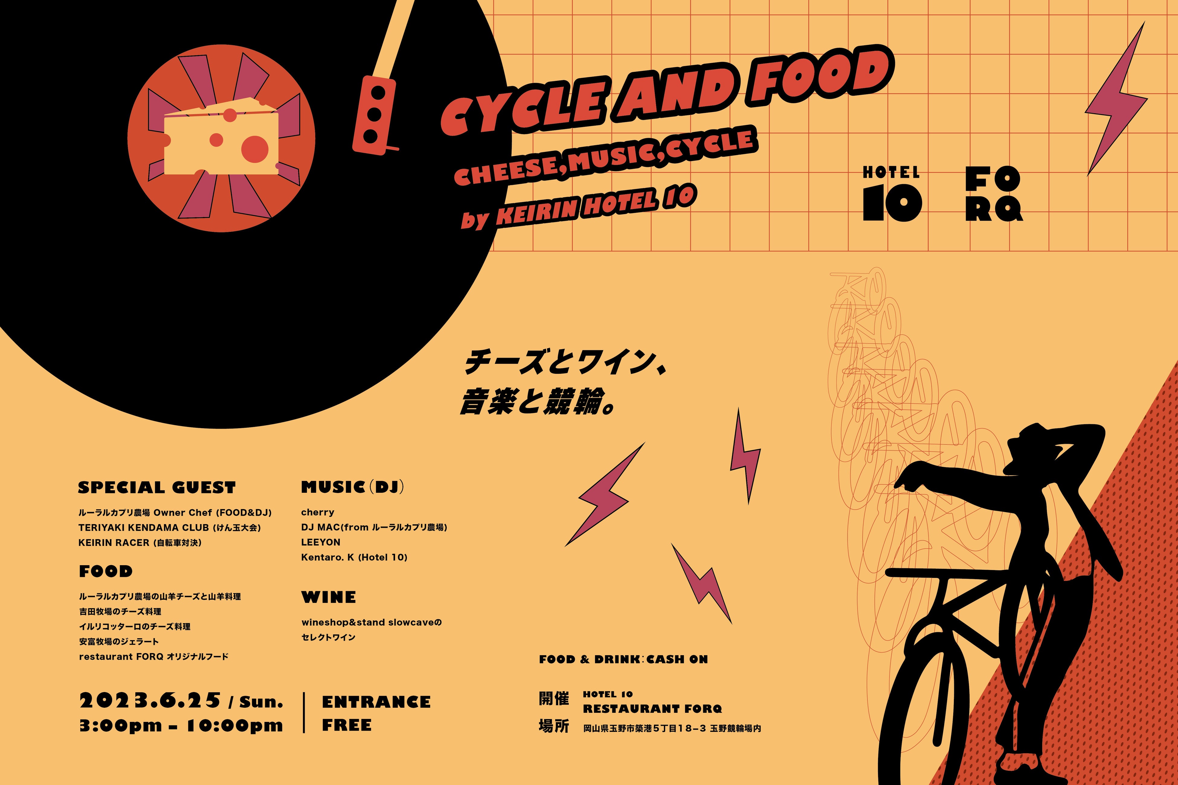 KEIRIN HOTEL 10のレストラン「Restaurant FORQ」は、瀬戸内の食材を使用したグリル料理やオリジナルスイーツを提供いたします。今回は、特別イベントとして岡山のチーズとワインをテーマにフードイベントを開催。お料理だけでなく、競輪レースや音楽など、1日中満喫できる企画をご用意しています。当日は、岡山県産チーズの食べ比べや、自転車最高速度対決や、けん玉大会【FREESTYLE KENDAMA DOJO】や、競輪解説講座など、さまざまな体験がお楽しみいただけます。入場料は無料、ホテル宿泊者だけではなく、一般のお客様も参加可能です。
