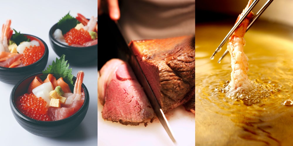 低温で時間をかけてじっくりジューシーに焼き上げるホテル伝統のローストビーフや天麩羅、いくらやマグロなど、お好みの海鮮がのせ放題のオリジナル海鮮丼に、揚げたてソースかつ丼・天丼など、ライブ感あふれるシェフのクッキングサービスで出来立てを提供するほか、ニューオータニ自慢の和・洋・中のメニューをご用意いたします。また、夏季限定メニューとして、「桃とフルーツトマトの冷製カッペリーニ」も登場!優しい甘みのひんやりパスタを前菜感覚でお楽しみください。