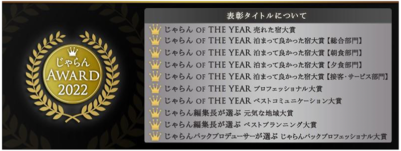 【審査基準】『じゃらん』編集長の審査により、新規性・独自性に特に優れたプランやプロモーション、取り組みをした宿泊施設に贈られます。