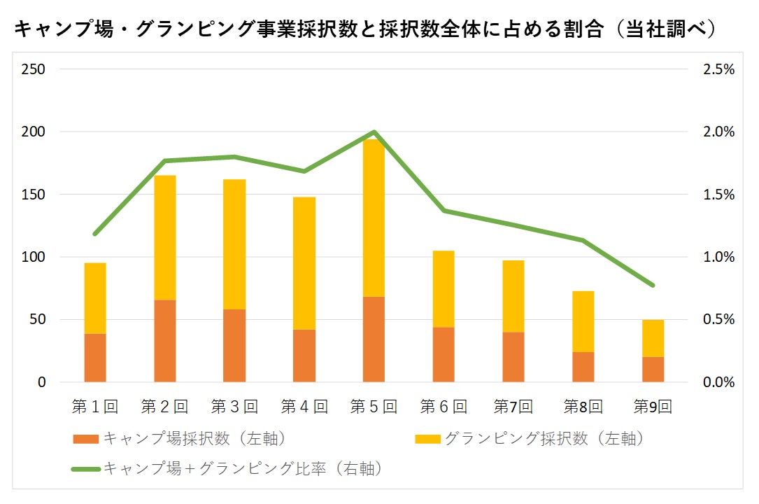 事業再構築補助金の採択状況は以下の通り。一時期の爆発的な採択数増加からは落ち着きを見せていますが、毎回50~100件のキャンプ場・グランピング事業が採択を受けています。