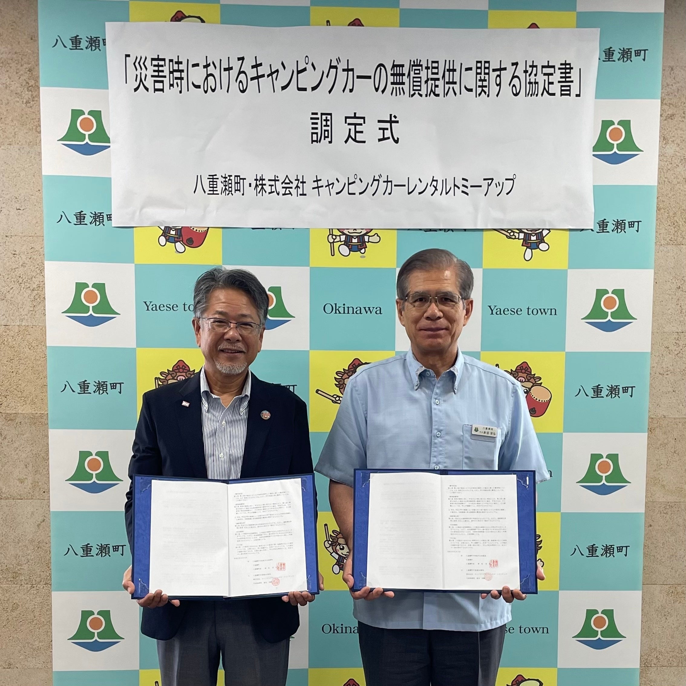 内容 :八重瀬町内において災害等が発生し、八重瀬町から要請があった場合に、当社のキャンピングカーを提供する。トミーアップは要請を受けた場合に、最大5台の車両の提供に努める。