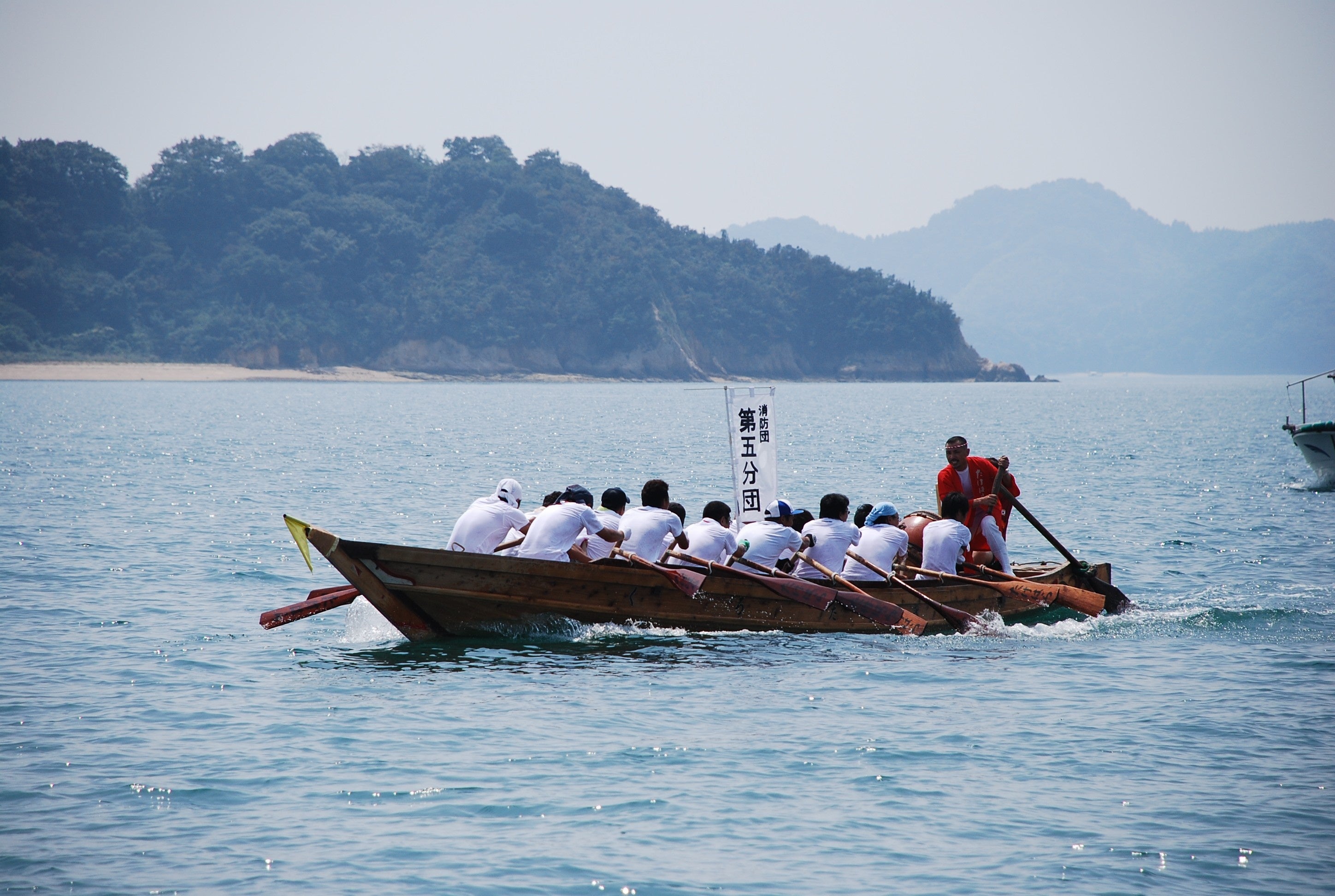 櫂伝馬とは海での情報伝令の役目を担った木造船で、14人の漕ぎ手が独特の掛け声と太鼓で調子を合わせ、心を一つにして櫂の動きを合わせることで前進する仕組みです。その後、当初の役割から神事としての意味合いを持つようになり、今では祭礼行事に伴う競漕へと趣が変化しています。