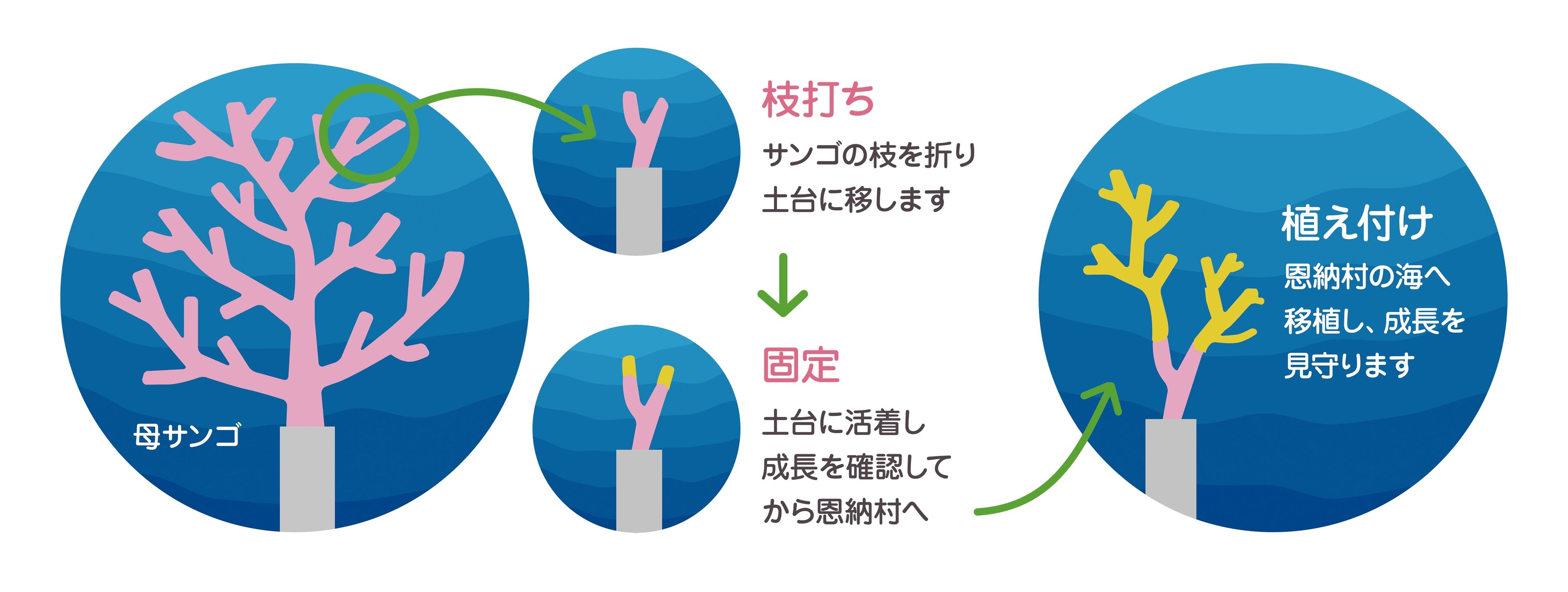 ★サンゴ礁再生プロジェクトの方法 ①親となるサンゴの育成。 ②親サンゴが産卵し恩納村海域へのサンゴの幼生の供給を増やす。また、卵の一部を回収し、サンシャイン水族館にてサンゴの赤ちゃんを飼育。 ③成長した子サンゴを恩納村の海へ移植。 |