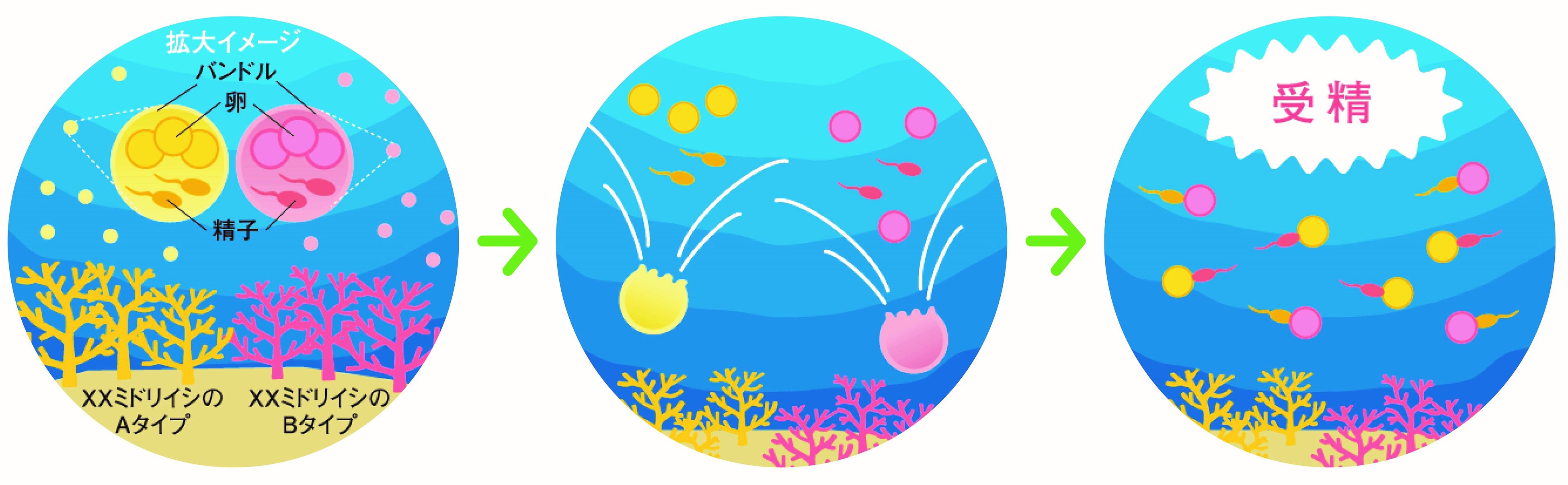 (※1)サンゴ産卵時には、卵と精子が詰まったバンドルが放出され、バンドルが割れて、中の卵と精子が水中へ飛び出てきます。別の親由来の卵と精子が受精します。