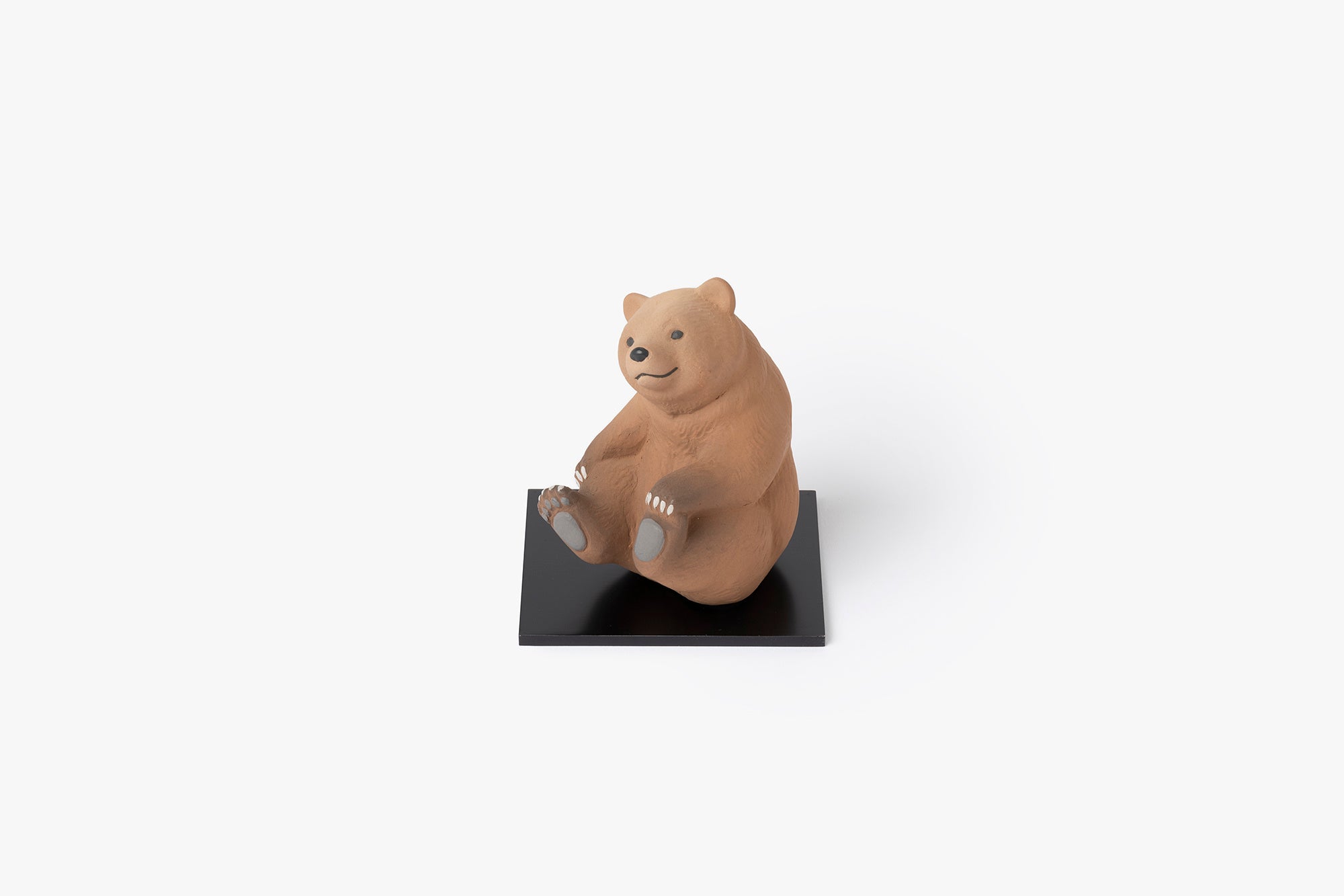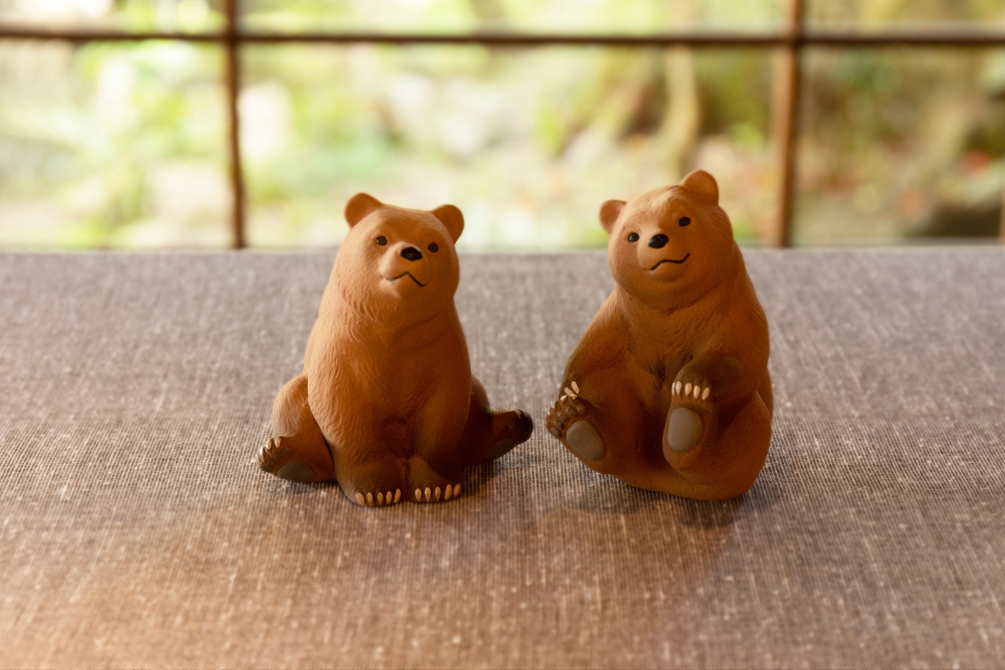山へと思いを馳せるしつらえとしての博多人形「クマ」。博多人形師松尾吉将制作。