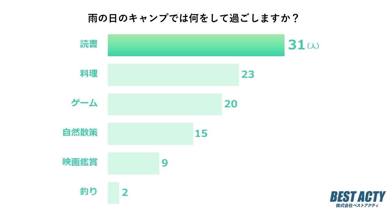 雨の日のキャンプでの過ごし方について100人にアンケートを行ったところ、「読書」と回答する人が最も多い結果となりました。