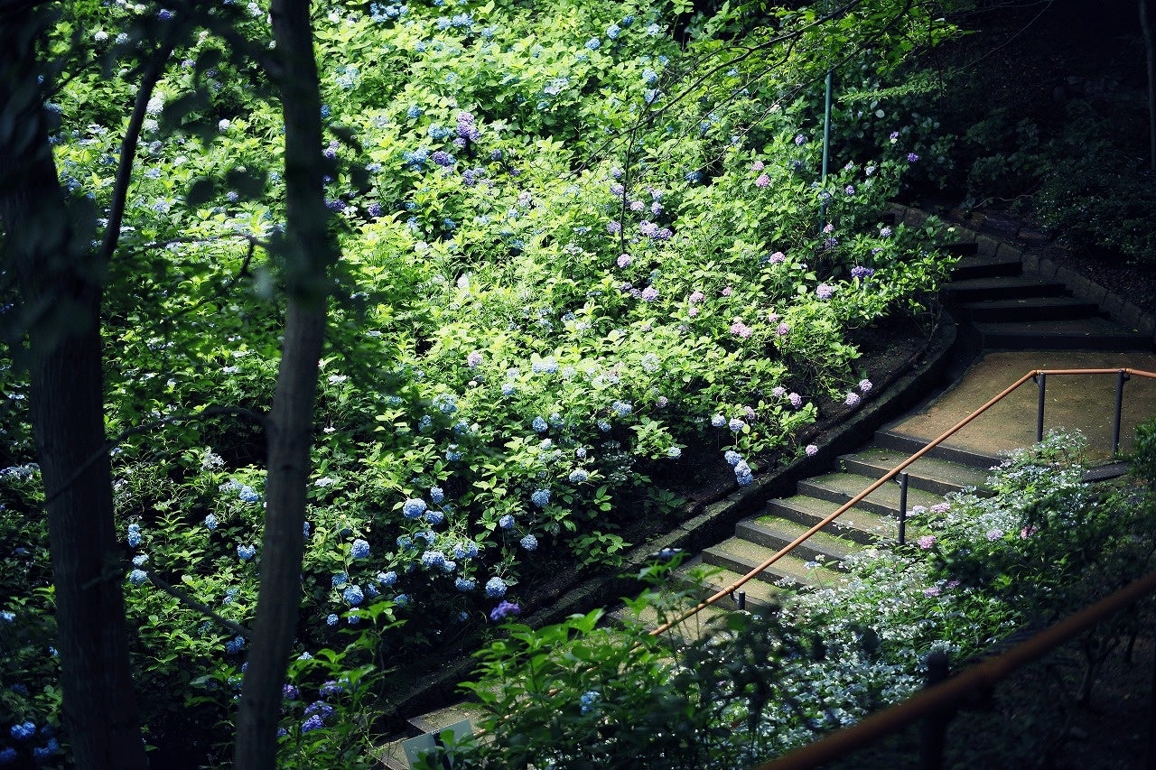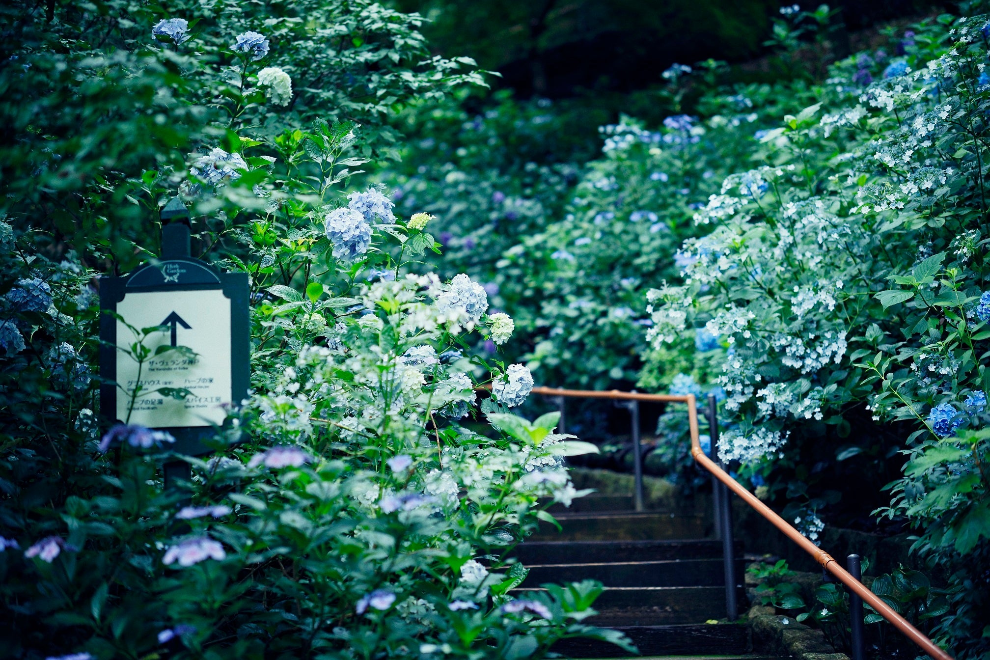 神戸布引ハーブ園の癒しの散歩道。木漏れ日を浴びながら、アジサイ散策をお楽しみください。