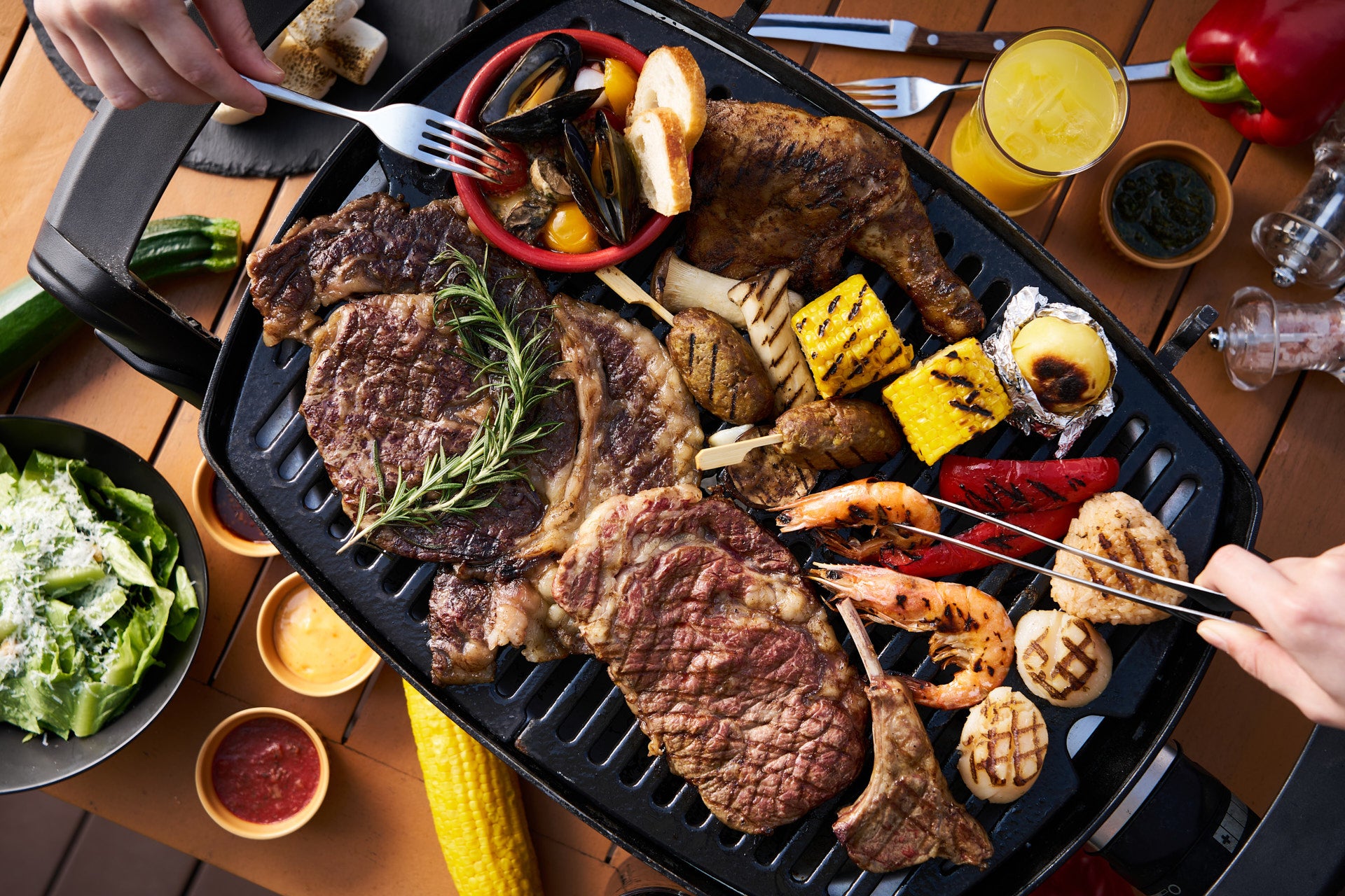 シーザーサラダ、シーフードプラッター(天使の海老、烏賊、帆立貝)、葡萄牛ロイン150g、ラムチョップ、骨付き鶏もも肉のケイジャンマリネ、骨付きソーセージ、キムチとチーズの焼きおにぎり、焼き野菜(ポテト、ナス、ズッキーニ、パプリカ、コーン、エリンギ)
