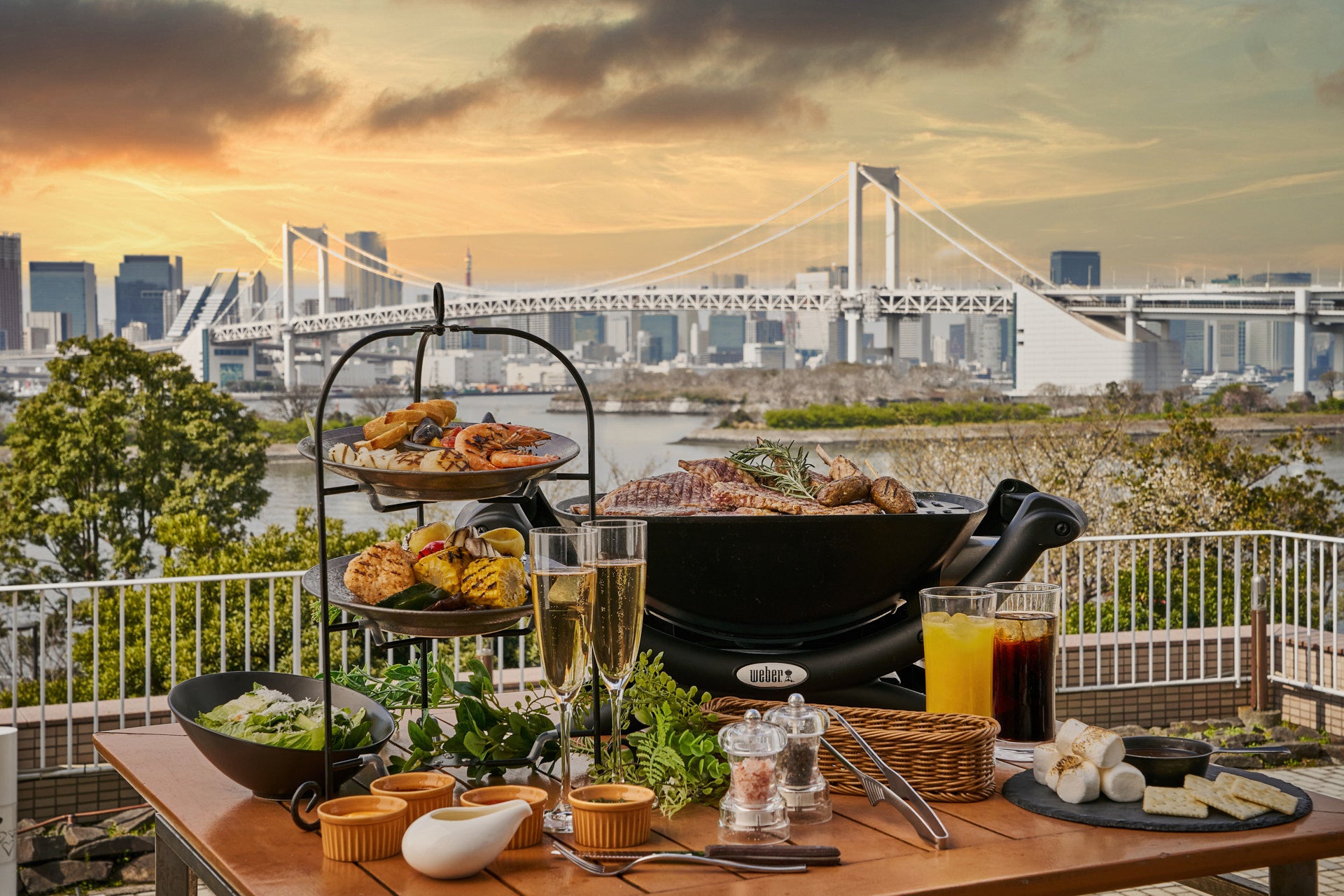 開放的なオープンテラスでレインボーブリッジや東京タワー®、東京湾を眺めながら楽しめる毎年大好評のBBQテラス「アブレイズ」では、手ぶらでラグジュアリーな体験ができるコースをご用意しています。なかでもおすすめは圧倒的な存在感とそのボリュームで人気のトマホークステーキが付いたコース。約1.2kgのトマホークステーキをご自身で焼く体験ができるBBQは貴重で、ホテルシェフがアレンジした肉の焼き方マニュアルに沿って作ることで肉汁たっぷりのジューシーなステーキをご堪能いただけます。ディナーコースでは、天使の海老や帆立貝、ムール貝が盛りつけられたシーフードプラッターや国産牛リブロース、ラムチョップにキムチとチーズの焼きおにぎりが付いたボリューム満点のメニューをご用意しています。デザートは季節限定で、夏はかき氷、秋はご自身で焼いたマシュマロとチョコレートをクラッカーで挟んだスモアをご提供いたします。さらに、すべてのコースには9種類のソフトドリンクのフリーフローがセットになっているのも本プランの魅力です。