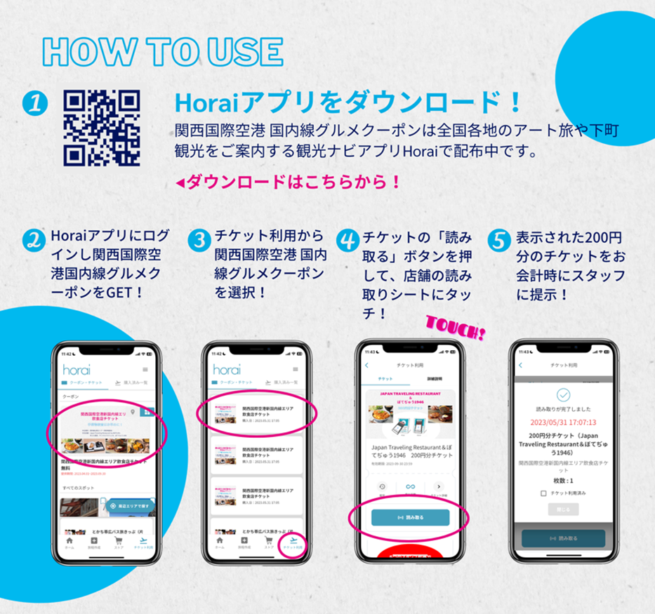 2023年6月19日から10月1日の期間中(期間内でも利用枚数が予定数に達した時点で終了予定)、scheme vergeが提供する観光ナビアプリ「Horai」上で、関西国際空港国内線エリア内の飲食店で利用できる200円割引クーポンを配布します。