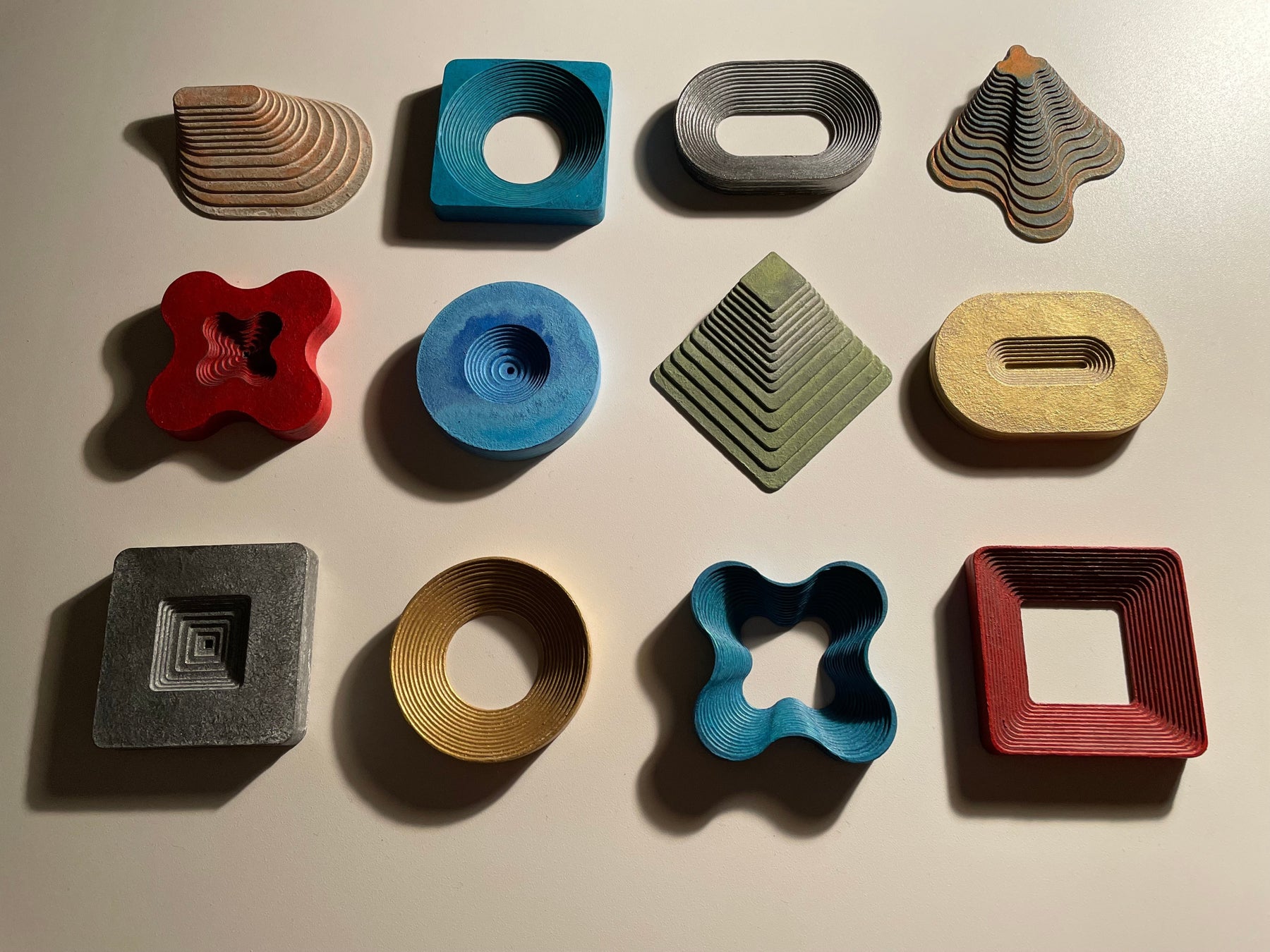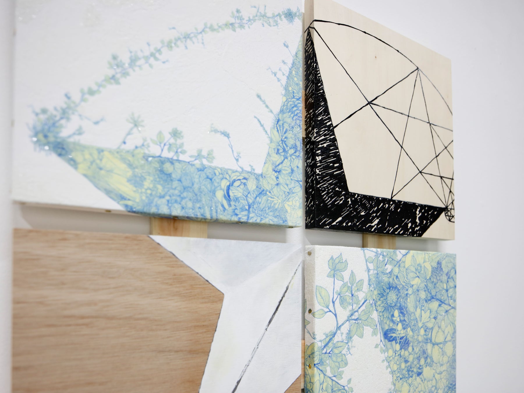 木や紙・アクリル樹脂を主な素材として、綿密に構築した設計図を基にオリジナルパーツを組み合わせた幾何学的な作品を制作している。それらの建築的な構造物は抽象的な形状でありながら、時に都市のジオラマの様にも見える。