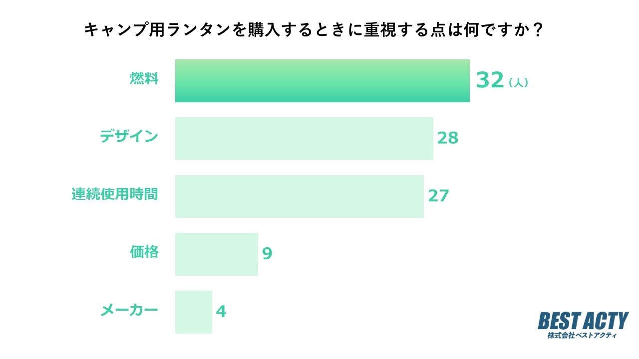 キャンプ用ランタンを購入するときに重視する点について100名にアンケートを行ったところ、「燃料」と回答する人が最も多い結果となりました。