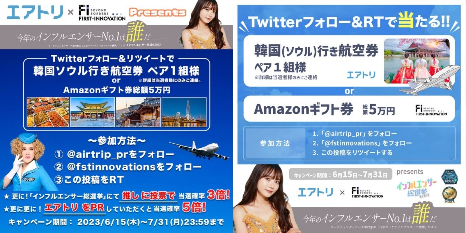 今回韓国ソウル行きペア航空券1組、Amazonギフト総額5万円をプレゼントする『エアトリ×FI』インフルエンサー総選挙コラボキャンペーンを開始いたしました。