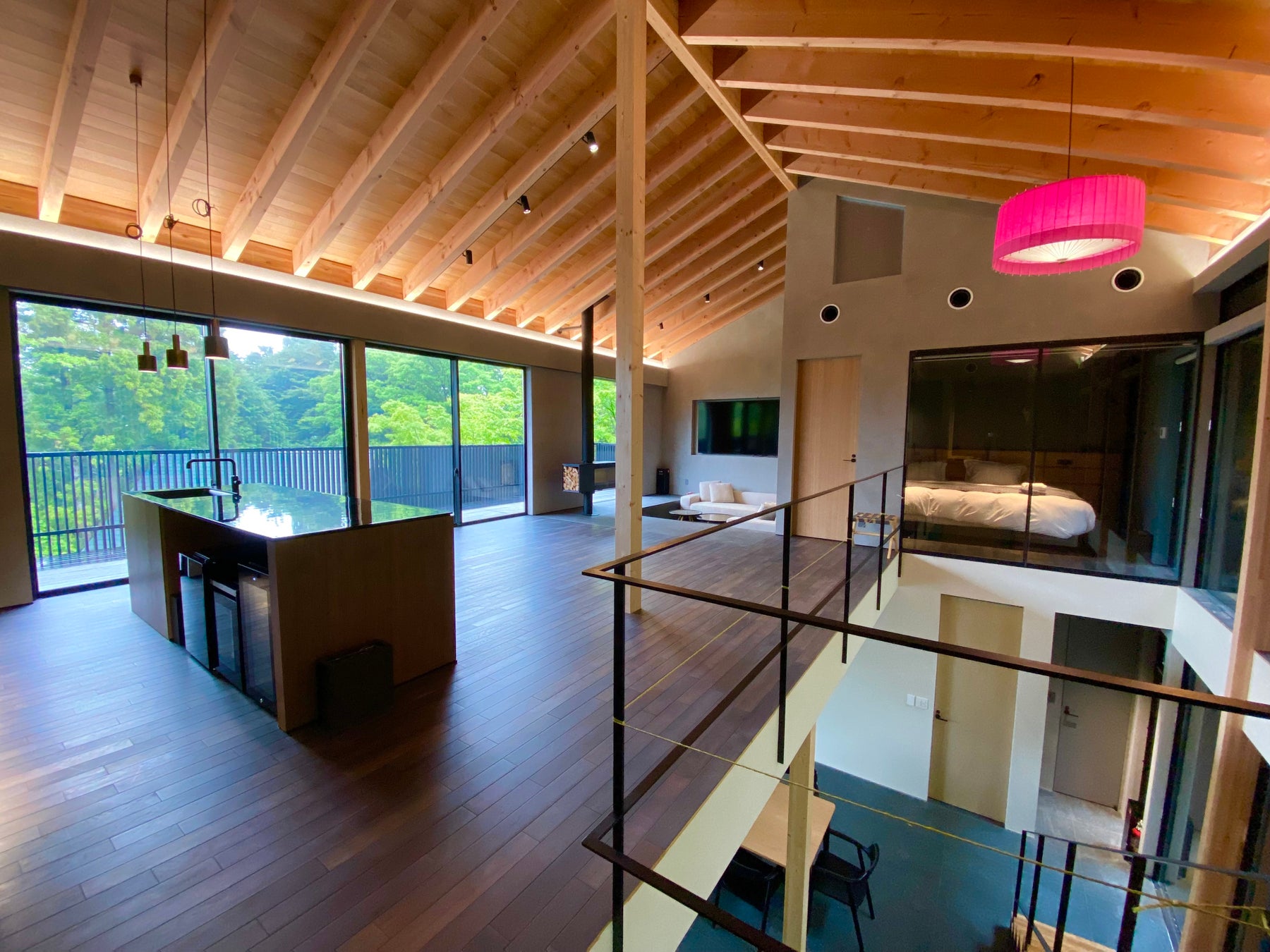 ガラスで大きく覆われた部屋は内外の空間がシームレスに繋がり、自然の風、光を感じ、箱根を体感できるリビングルームを創造しました。