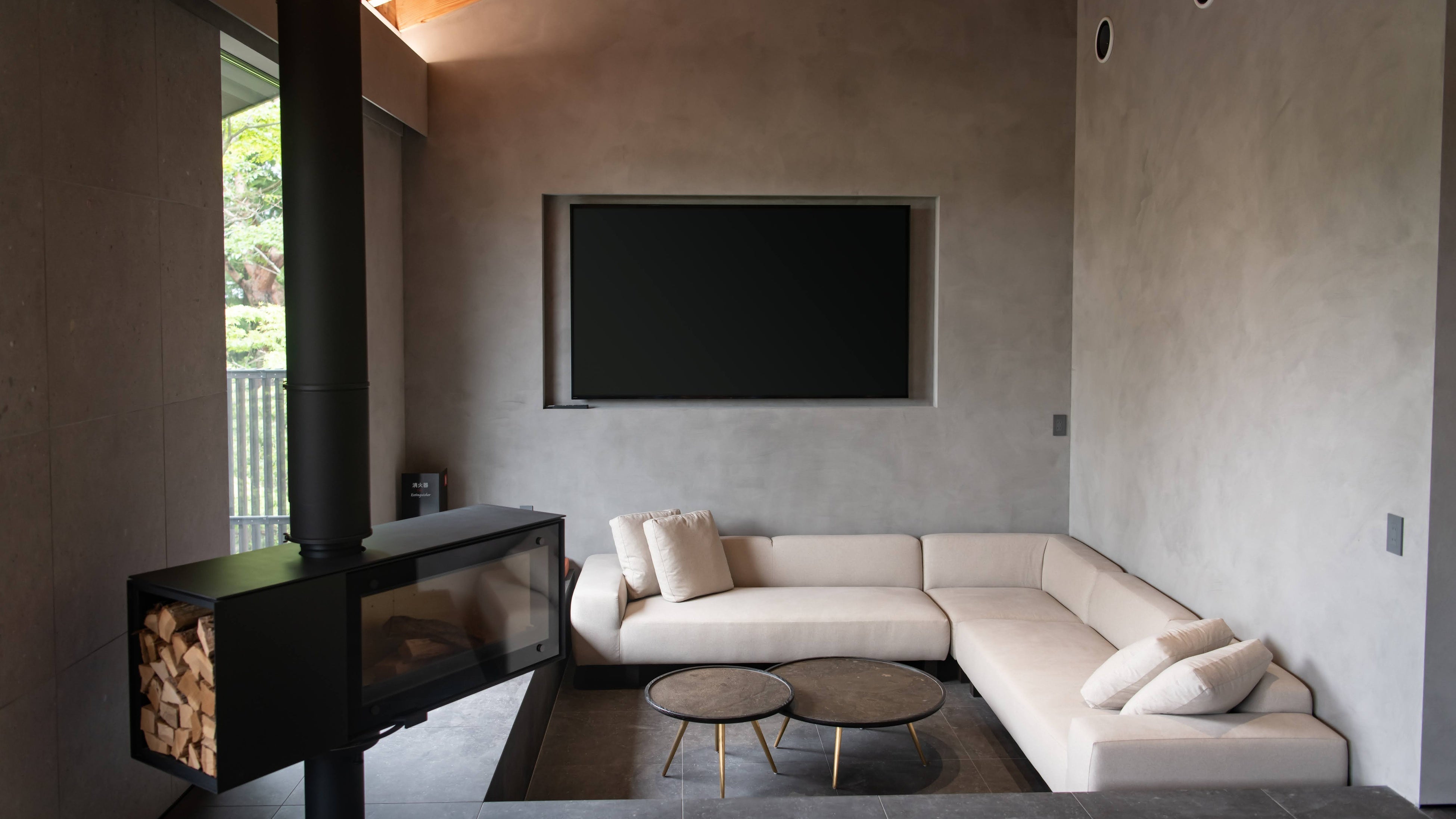ガラスで大きく覆われた部屋は内外の空間がシームレスに繋がり、自然の風、光を感じ、箱根を体感できるリビングルームを創造しました。