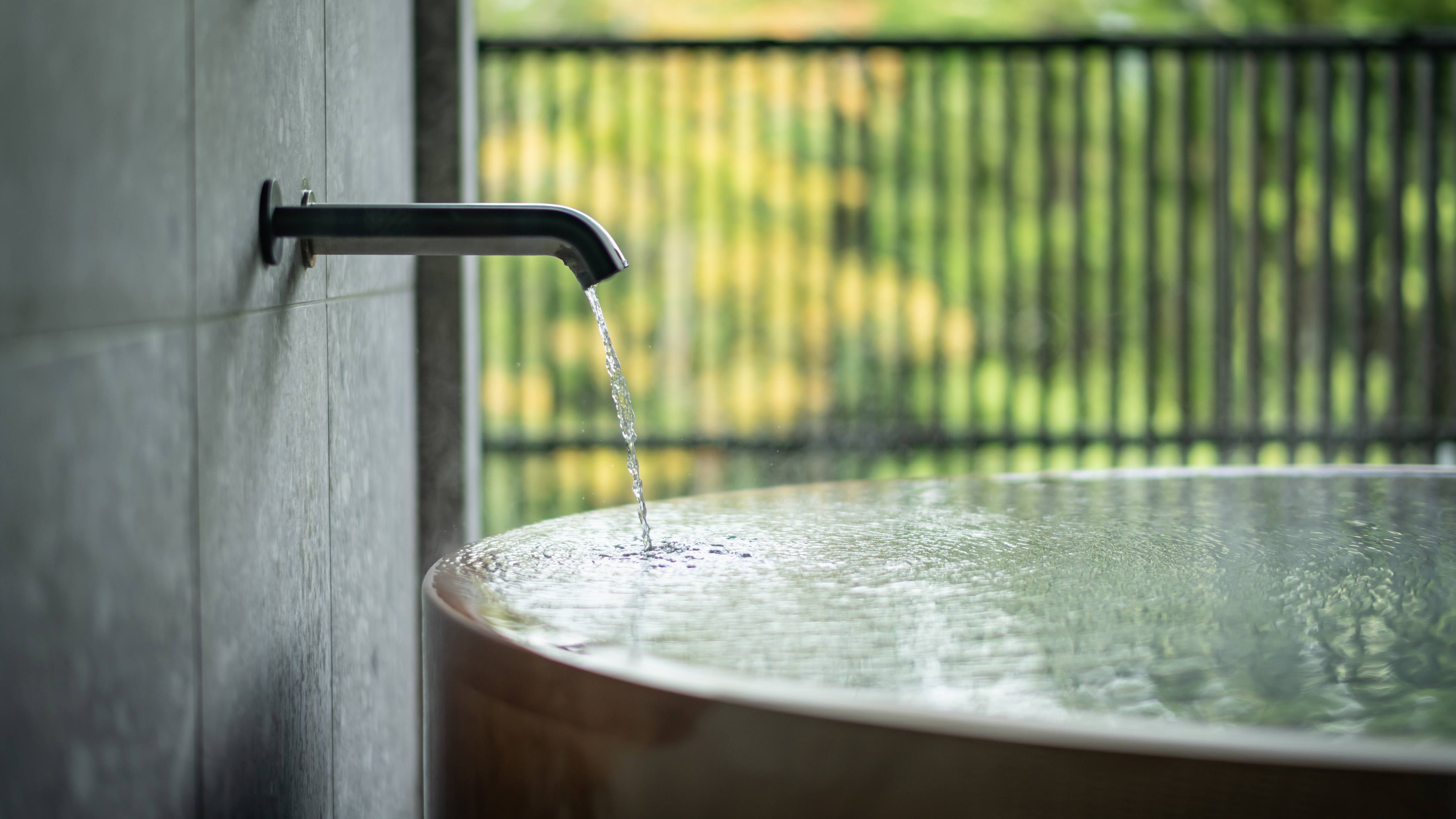 心地よい香りの檜風呂の半露天風呂には、かけ流しの美肌効果のある大涌谷白濁温泉が贅沢なほど注がれています。