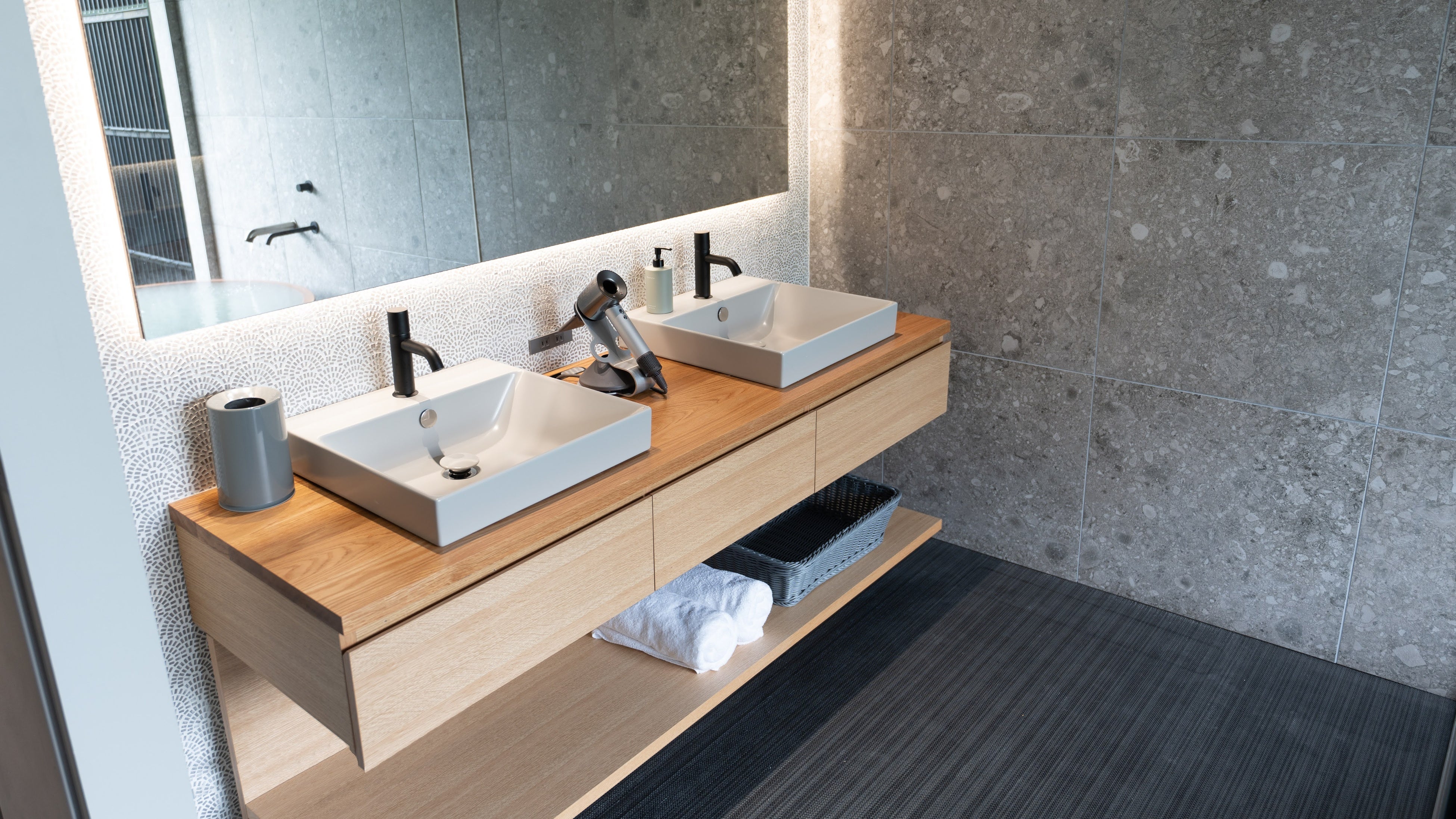 間接照明を一面に使用し自然の明るさを再現した設計の洗面台。
