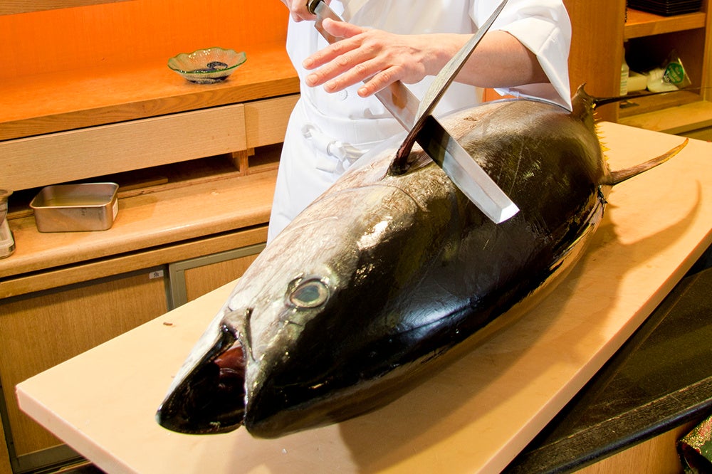 沖縄は、全国有数のマグロ漁獲量を誇ります。沖縄近海で獲れる生マグロをまるごと一頭さばき、握りやカマ焼きなどでご賞味いただけます。