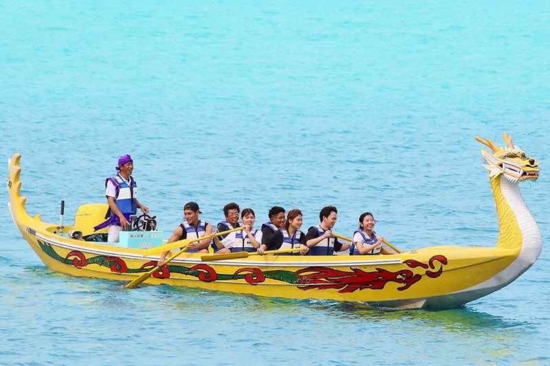 沖縄の伝統行事「ハーリー」は、伝統漁船で競漕を行います。クルーズを楽しみながら、櫂を使ったハーリー体験です。