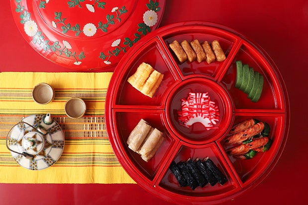 琉球王国時代に客人をおもてなしする際に使用された琉球漆器(写真上)