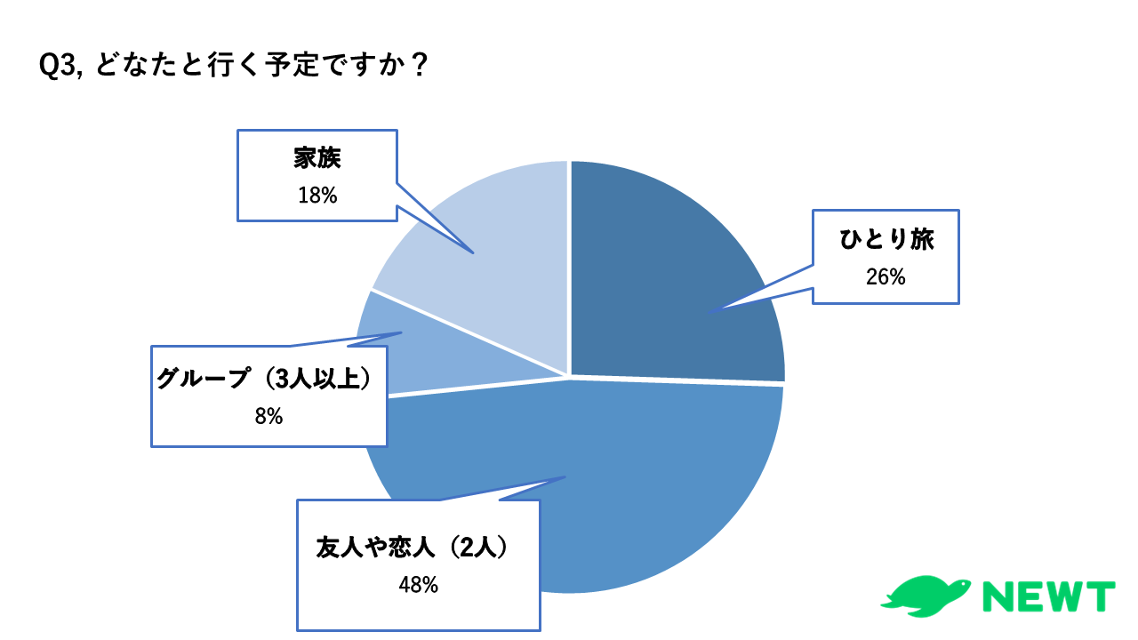 昨年は、ひとり旅が33.3%だったのに対し、今年は26%まで減少しました。加えて、グループ旅行や家族旅行といった複数人での旅行は伸び悩みをみせる結果となっています。友人や恋人との2人での旅行の需要が48%と半数近いことがわかりました。