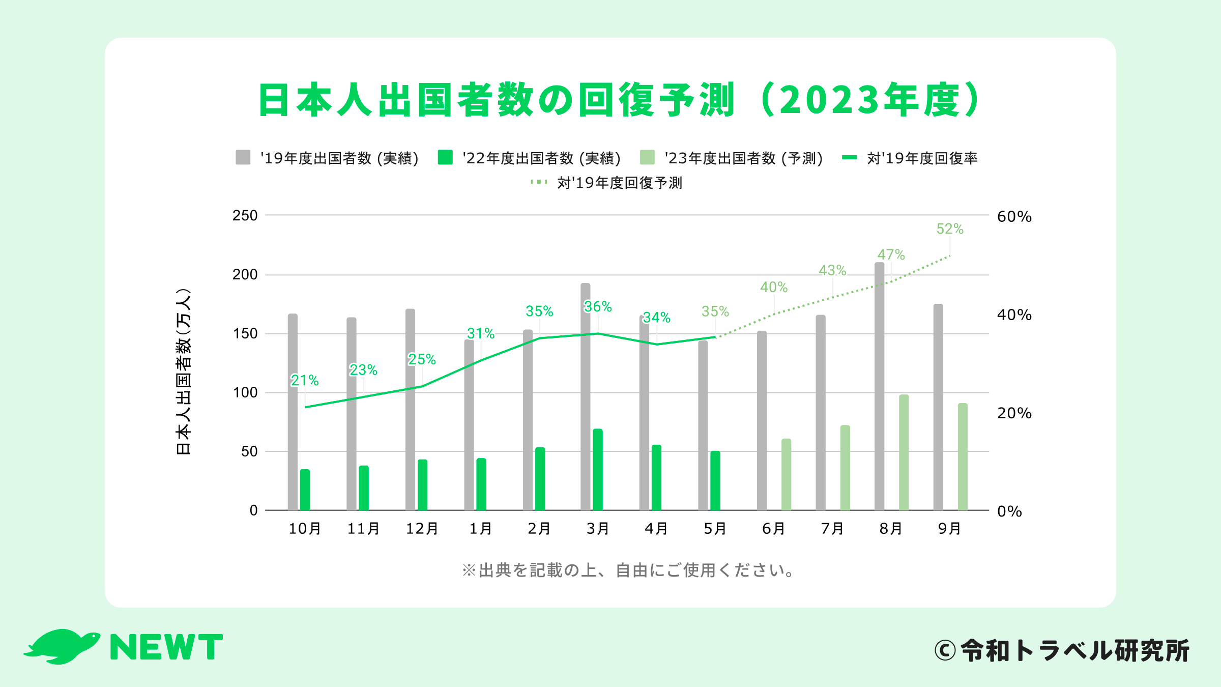 心理障壁の観点も踏まえつつ、算出した取扱額ベースの回復率から日本人の出国者数の回復率を推測する形で試算しました。詳しい前提条件や算出方法は、以下、公式noteをご参照ください。