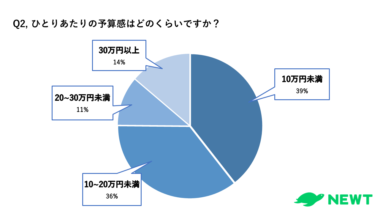 Q1で海外旅行に行く予定があると回答された方への追加質問で、ひとりあたりの予算感はどのくらいなのかについて、10万円未満が39%、10万~20万円未満が36%、20万~30万円未満が11%、30万円以上が14%という結果になりました。