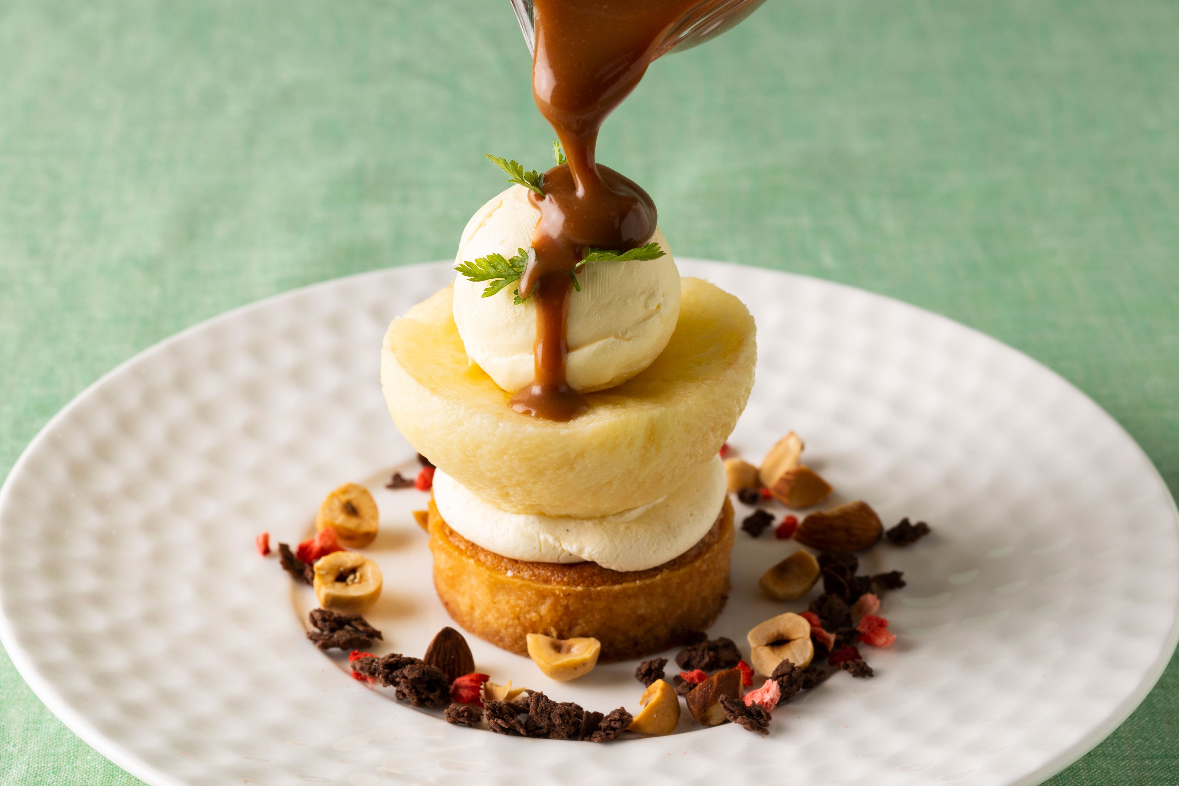 別皿にはごろっと半玉を使用した桃のタルトに自家製バニラアイスクリームをのせ相性抜群のカフェモカソースをかけてお召し上がりいただけます。