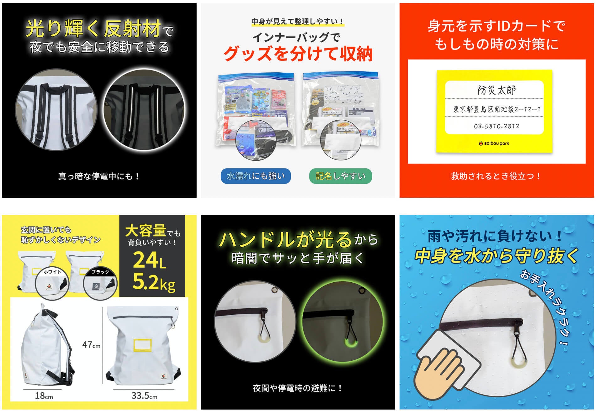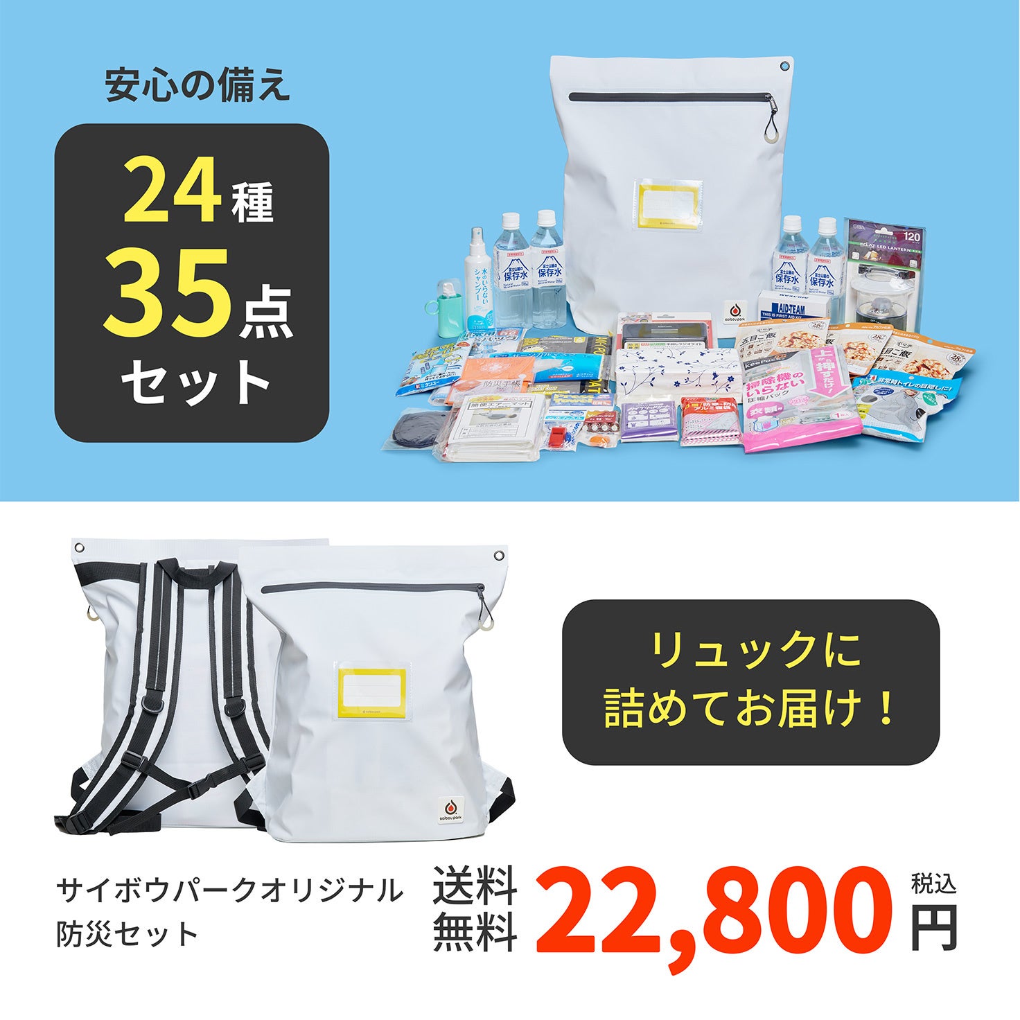 災害時、とっさに持ち出して避難するための防災セット「ターミナル」。SAIBOU PARKオリジナルの商品です。水や汚れに強いターポリン生地、止水ファスナーを採用しているので、地震だけでなく台風やゲリラ豪雨による避難時にもご活用いただけます。国産の非常食をはじめ、防災士が厳選した防災グッズを詰め合わせた贅沢なセット内容です。