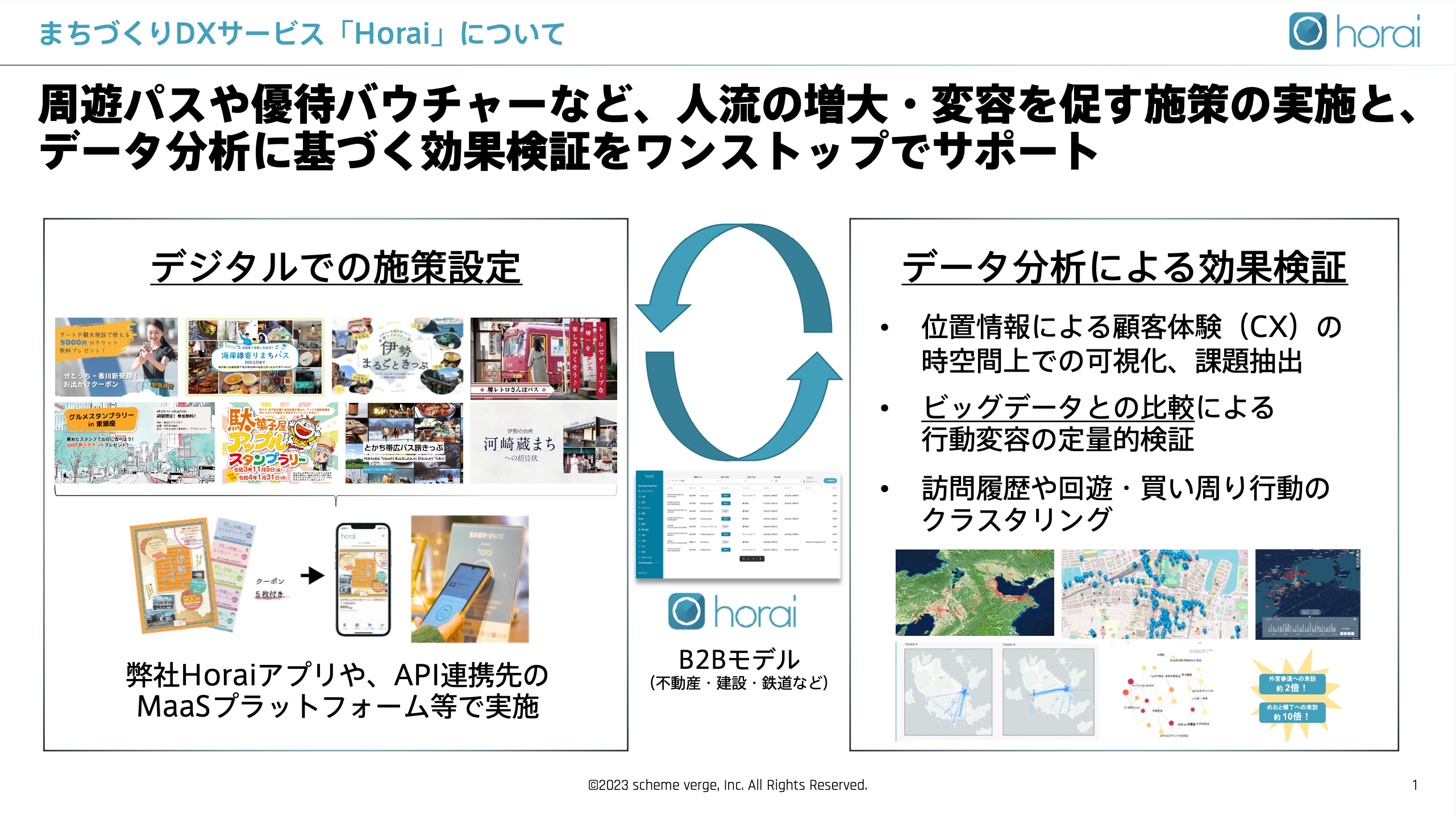 scheme verge株式会社は、都市工学とデータサイエンスを組み合わせてオペレーションに落とし込むノウハウを活かし、エリア活性化に関わるプロセスの再現性向上と、データによる改善判断の効率化・自動化に取り組んでいます。主力製品の「Horai エリアマネジメント(https://horai.sv/area_management)」を提供し、迅速なエリアマネジメント立ち上げと、交通から宿泊まで拡張性ある対応、観光地から都心部まで汎用な展開、そして継続的かつ不可逆的な施策の改善を支援しています。