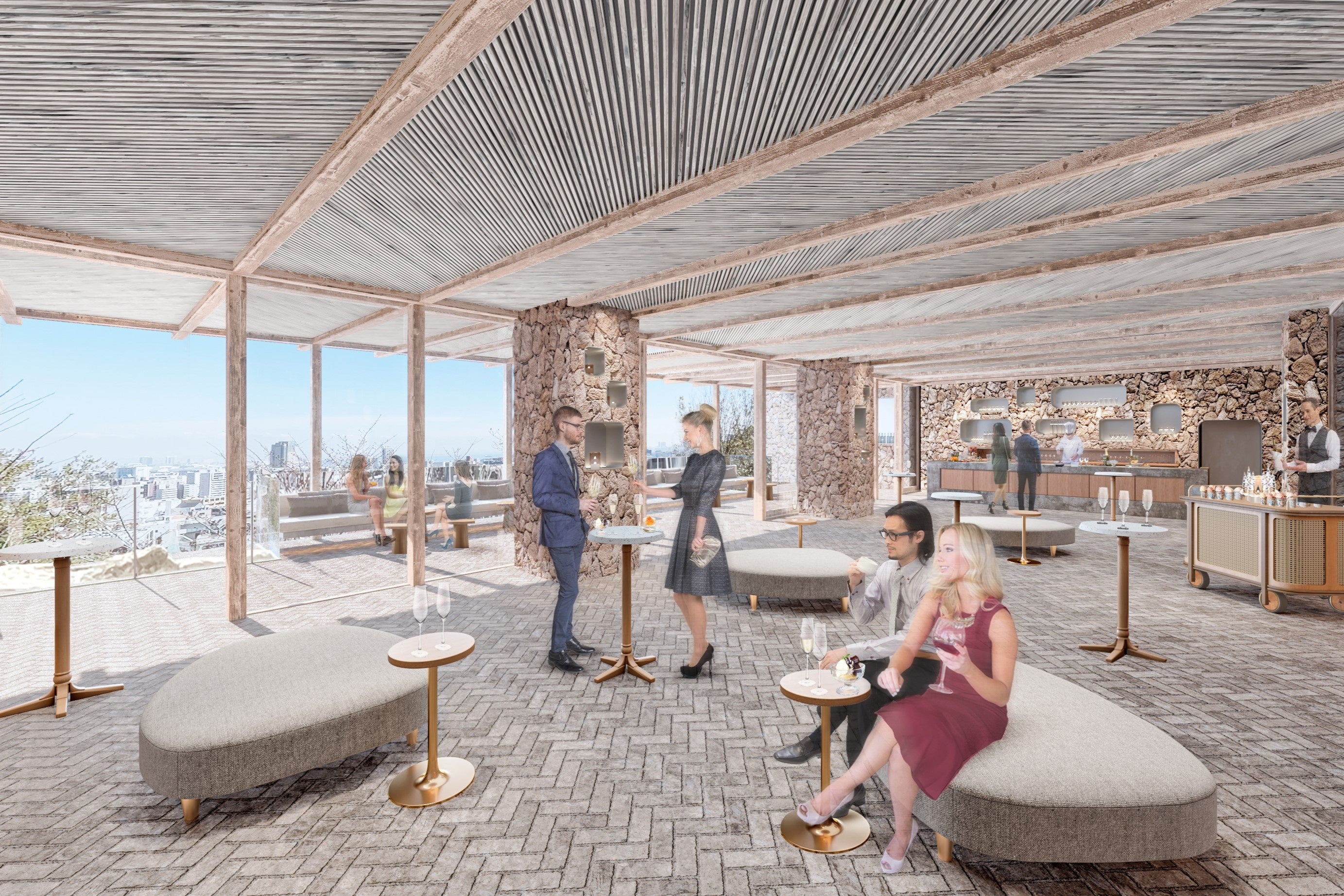 バンケットからつながる窓側スペースは、まるで海外リゾートのような石畳と自然素材を多用した開放的なテラスにリニューアル。扉の開口部を大きく、屋内ガーデンから外テラスまでがひと続きのオープンスペースに。