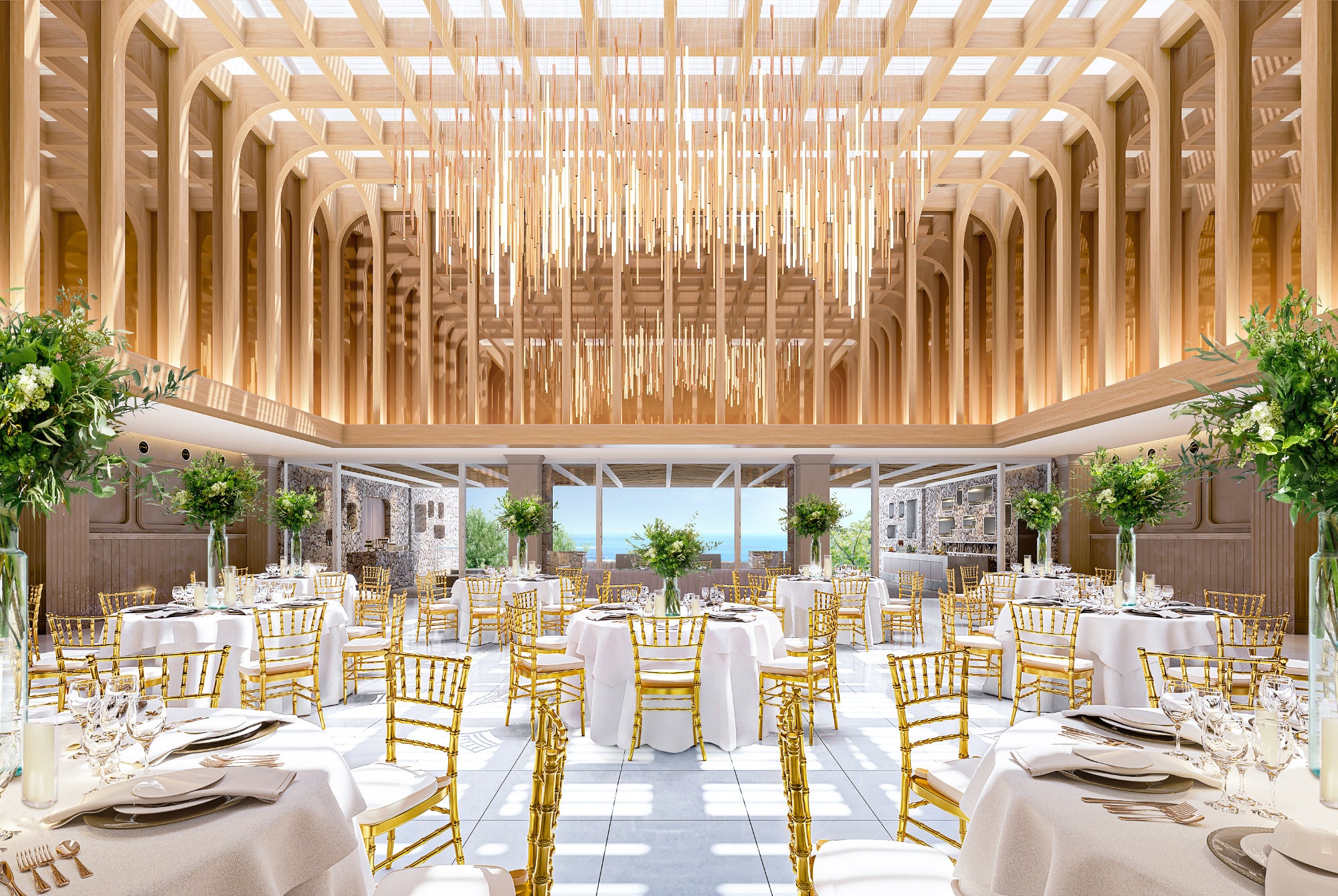 シャンパンゴールド色と木を基調とした上質感のある空間がゲストを優しくお出迎え。吹き抜けに煌めくシャンデリアの光の演出がドラマティックに空間を彩り、降り注ぐ自然光が会場をあたたかく包みこみます。