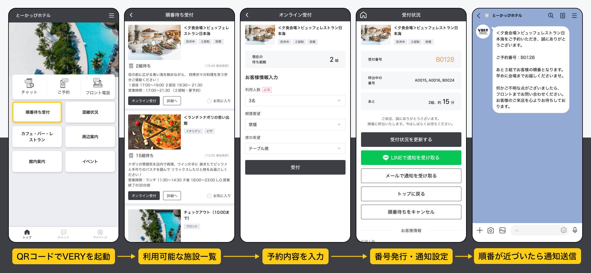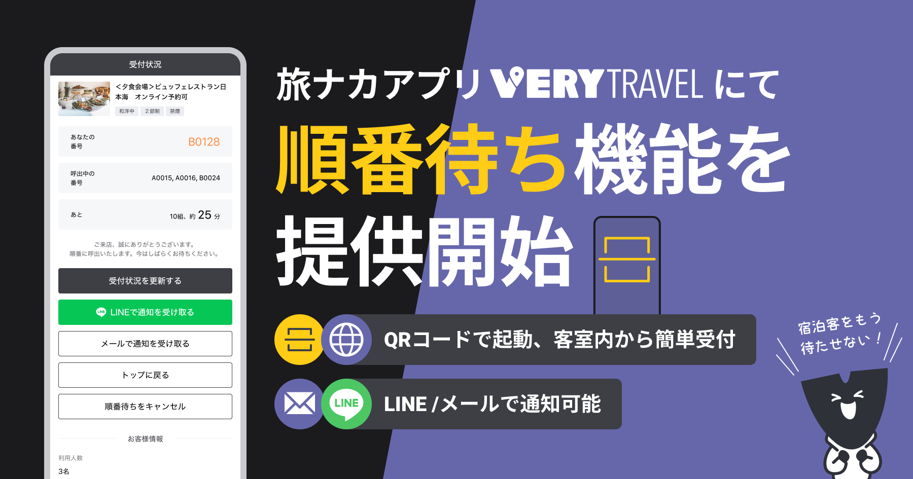 上記のような宿泊施設様のお悩みを解決するため、当社は宿泊施設に特化した「VERY順番待ち機能」を開発しました。