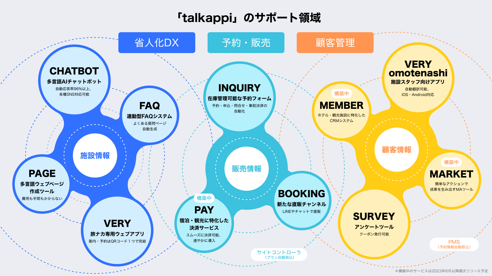 2023年6月現在は、「talkappi」を導入している施設においては、「VERY」および付随する施設スタッフ向けの多言語接客アプリ「VERY omotenashi」や順番待ち機能など、全ての標準機能を無償で提供しております。宿泊客は客室や館内各所に設置したQRコードを読み取るだけで利用可能になります。