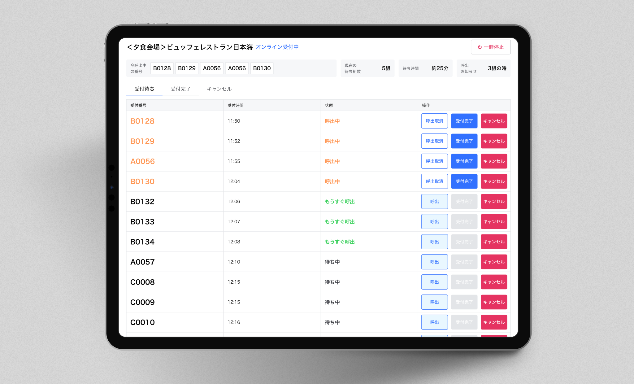 レストランの席数の制限により、入口での待機人数が多く混雑になる一方、順番になったお客様が現れない場合もよくある