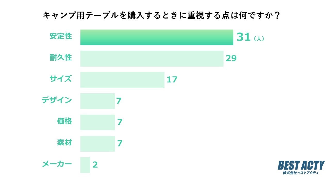 キャンプ用テーブルを購入するときに重視する点について100名にアンケートを行ったところ、「安定性」と回答する人が最も多い結果となりました。