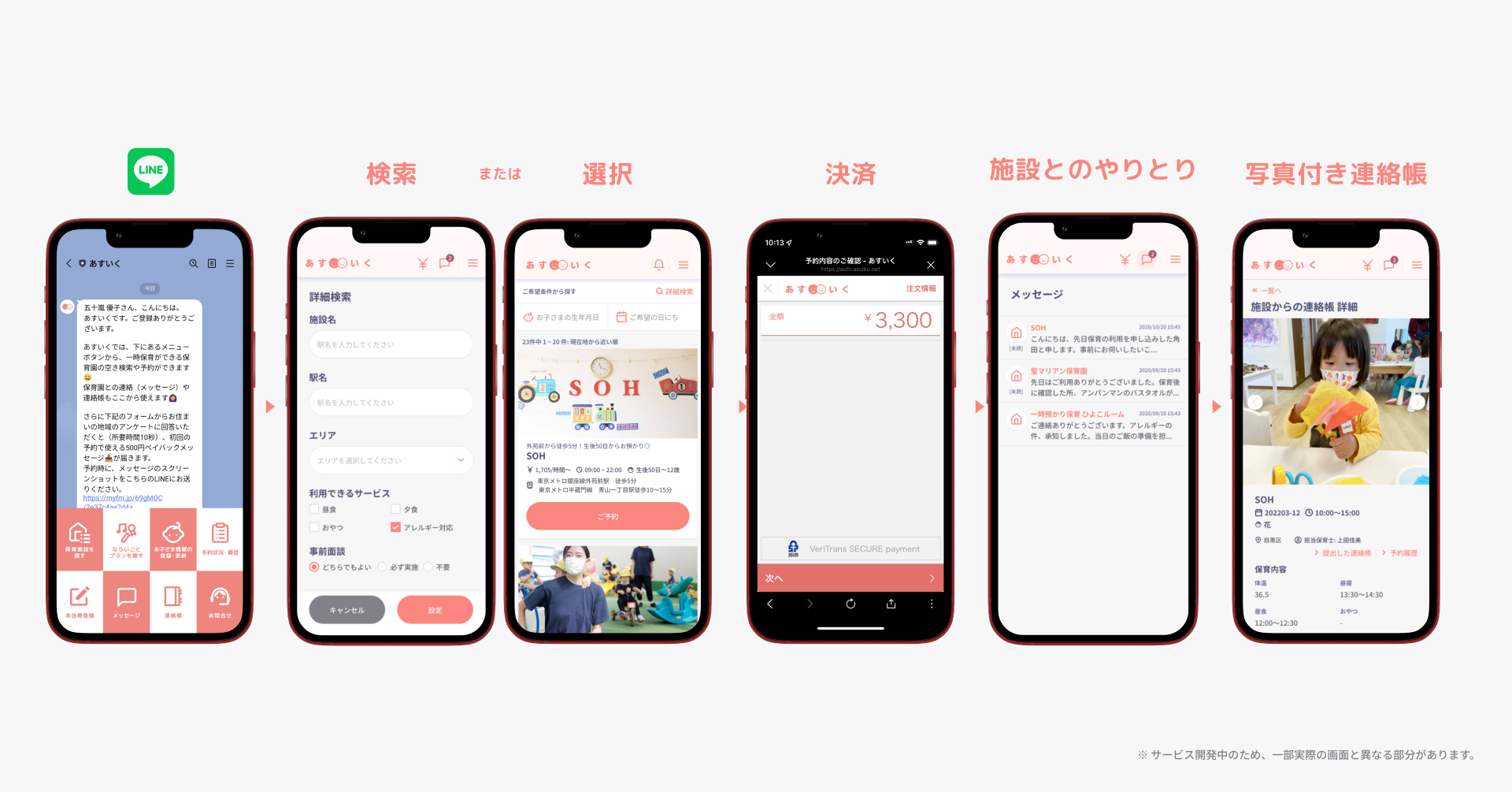 grow&partnersが運営する、スマホ&LINEで使える一時保育検索・予約サービス「あすいく」は、24時間365日、一時保育の空きをリアルタイムで検索し、そのまま予約、決済まで1分で完了できるシステムです。