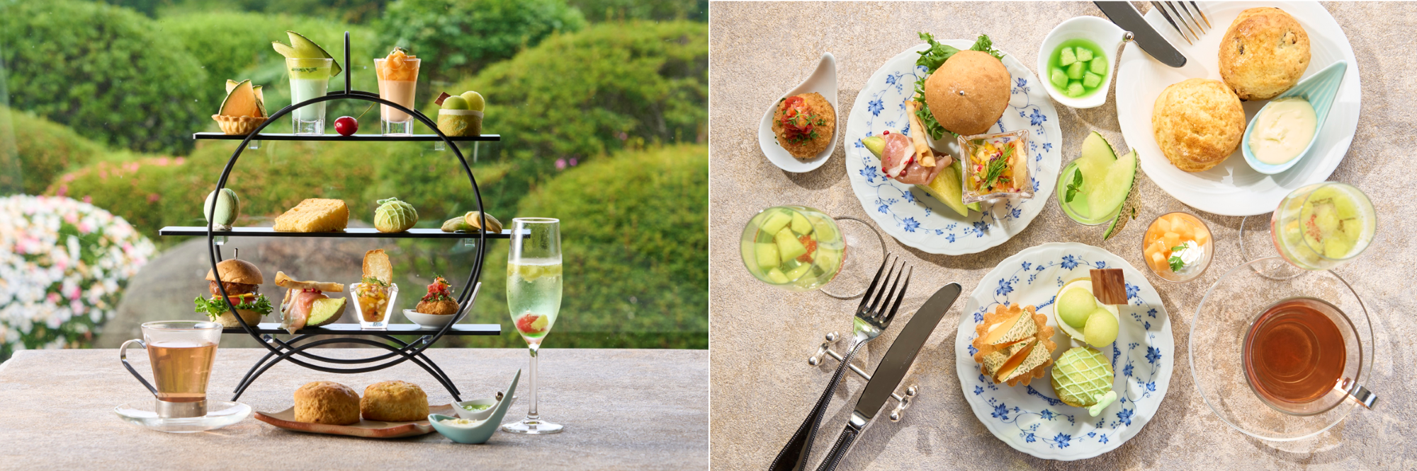 ウェルカムメロンソーダをはじめ、生ハムメロンや赤肉メロンのプティタルト、メロンムース、メロンマカロンなど、青肉と赤肉の2色メロンを贅沢に使用した16品にお飲み物が付いた、メロン尽くしのアフタヌーンティーです。