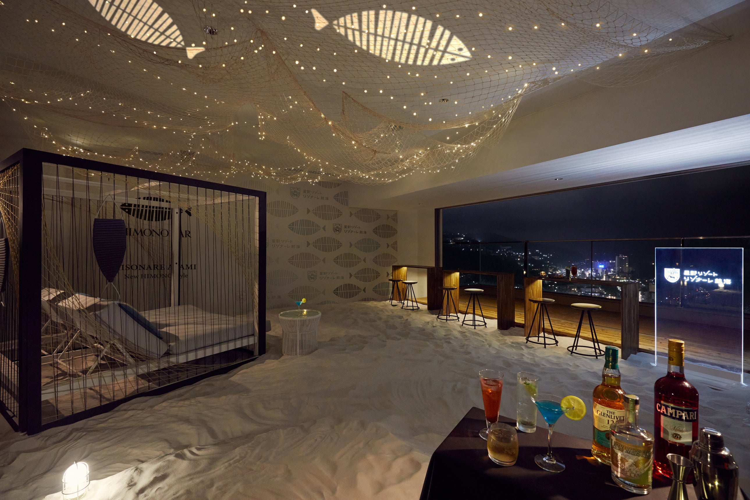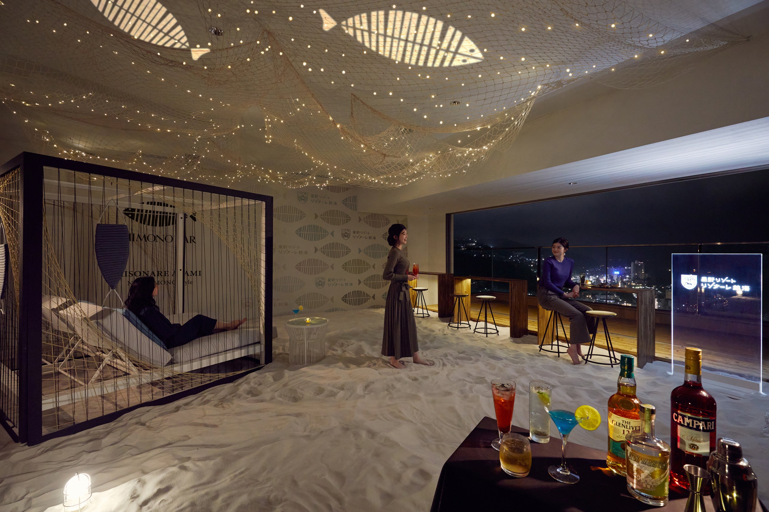 ソラノビーチ Books&Cafeを、干物のフォルムや網をモチーフにした装飾でスタイリッシュなBar 空間に設えます。メイン空間のカバナ席は、網で囲み、干物のオブジェを設えたデザインです。天井には網の装飾と干物型のライティングを施しており、ゆったりとくつろぎながらも、干物を目で楽しめます。また、窓側には、夜景が見えるようにハイテーブルとハイチェアを設置します。夜景を眺めながら干物とお酒を楽しめる、落ち着いた空間です。