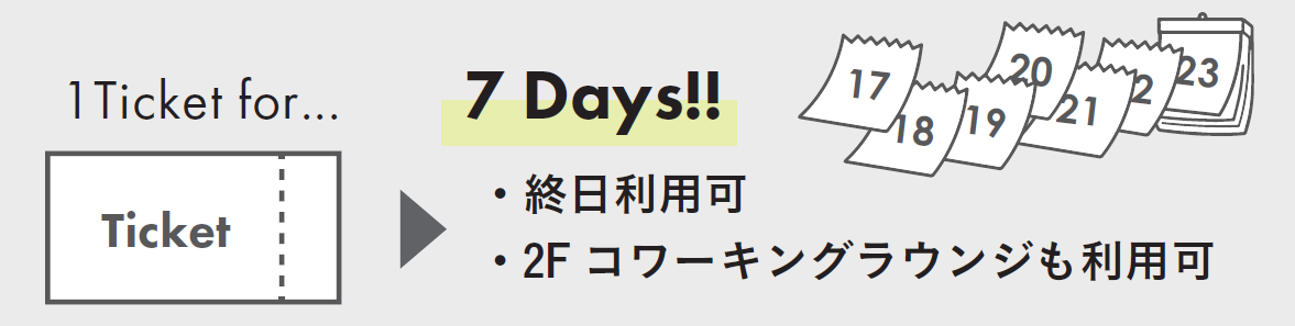 ワーケーションという新しい働き方・過ごし方をより気軽に体験していただけるように、今回のイベントでは月額会員様限定の2Fコワーキングラウンジも含めて、1枚のチケットで7日間自由にUをご利用いただけます。